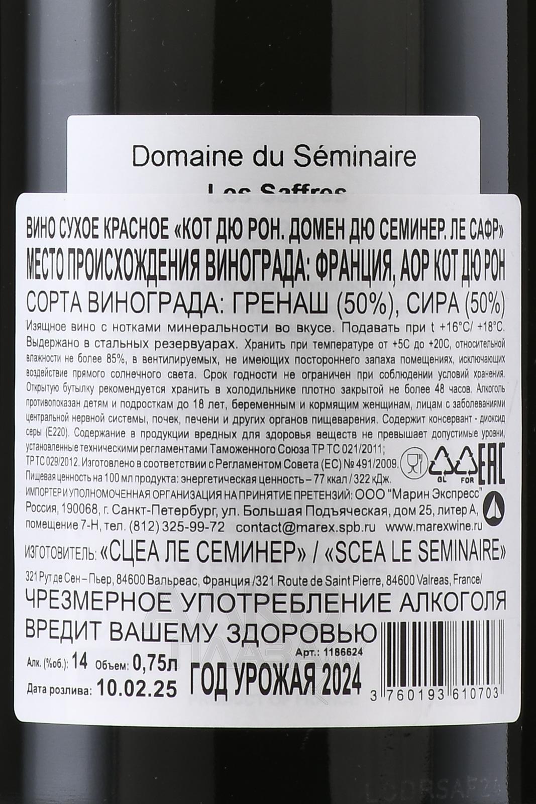 Красное сухое вино Domaine du Seminaire Les Saffres Cotes du Rhone 0,75 л происходит из южной части долины Роны во Франции. Виноградники расположены в зоне ронских холмов на участках с каменистыми почвами, которые местные виноделы называют saffres. Эти почвы хорошо прогреваются и обеспечивают естественный дренаж. Климат здесь тёплый, с выраженным влиянием ветра мистраль, который снижает риск заболеваний лозы и способствует равномерному созреванию ягод. Такие условия формируют напитки с выраженной фруктовой насыщенностью и пряным характером. Для производства используют традиционные для апелласьона сорта. Сбор урожая проводится при полной фенольной зрелости. Ферментация проходит в нейтральных ёмкостях с контролем температуры. Выдержка осуществляется преимущественно в бетонных резервуарах, без активного влияния дуба, что позволяет сохранить чистоту вкуса и терруарную выразительность.
