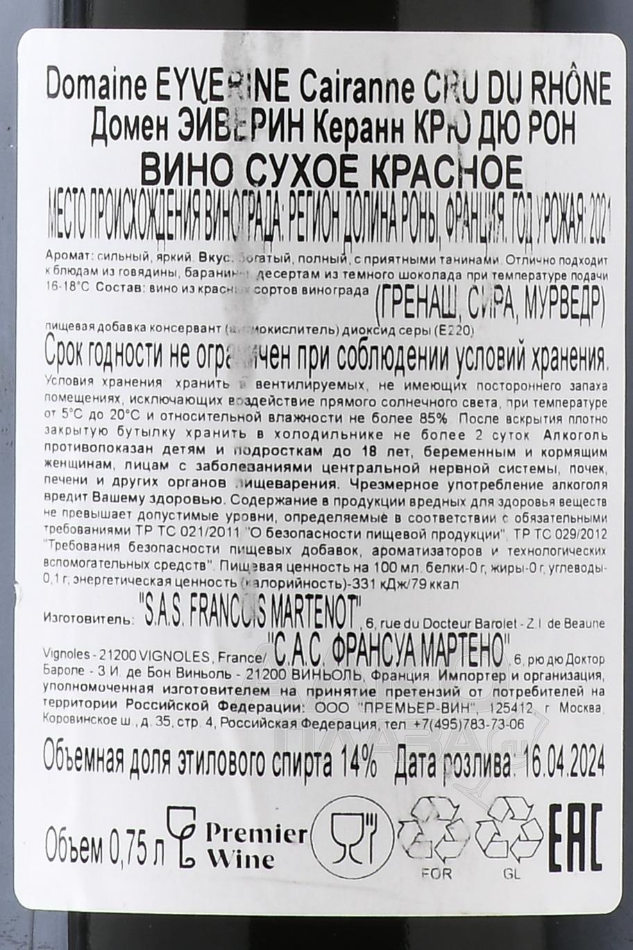 Красное сухое вино Domaine Eyverine Cairanne Cru du Rhone 0,75 л рождается на юге Долины Роны, в местности Керан. Виноградники расположены на террасах и пологих склонах с галечными, глинисто-известковыми почвами, хорошо аккумулирующими тепло и обеспечивающими дренаж. Климат — средиземноморский, с жарким летом и влиянием ветра мистраль, который снижает влажность и поддерживает санитарное состояние ягод. Для создания используют традиционные для зоны сорта, каждый из которых вносит вклад в структуру и ароматический профиль. Сбор проводят при полной зрелости, а ферментация проходит с контролем температуры.