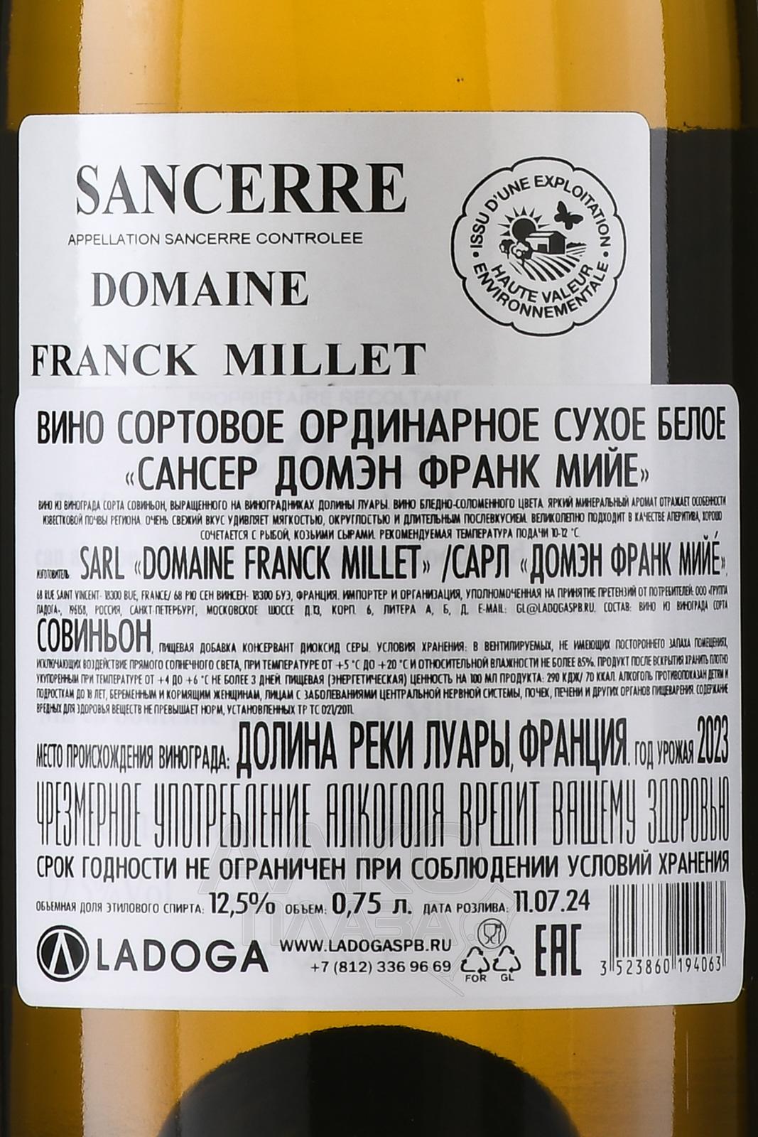 Белое сухое вино Domaine Franck Millet Sancerre 0,75 л производится в сердце долины Луары, в регионе Сансер, который считается эталонным для Sauvignon Blanc. Семейное хозяйство Франк Мийе владеет виноградниками на склонах с известняково-кремнистыми и глинисто-мергельными почвами, формирующими уникальный характер напитка. Терруар здесь сочетает прохладный климат и большое количество солнечных дней, что позволяет ягодам сохранить кислотность и развить сложный букет. Урожай собирается вручную, после чего подвергается мягкому прессованию, а сусло — ферментации при контролируемой температуре. Производство ограничено объемами винодельни, что гарантирует качество и сохранение стиля.
