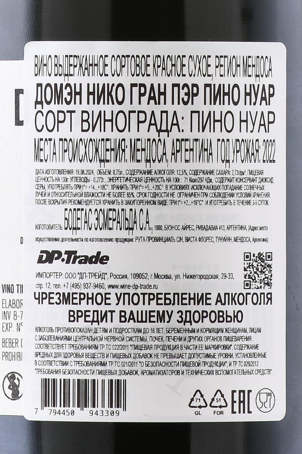 Domaine Nico Grand Pere Pinot Noir - вино Домен Нико Гран Пэр Пино Нуар 0.75 л красное сухое