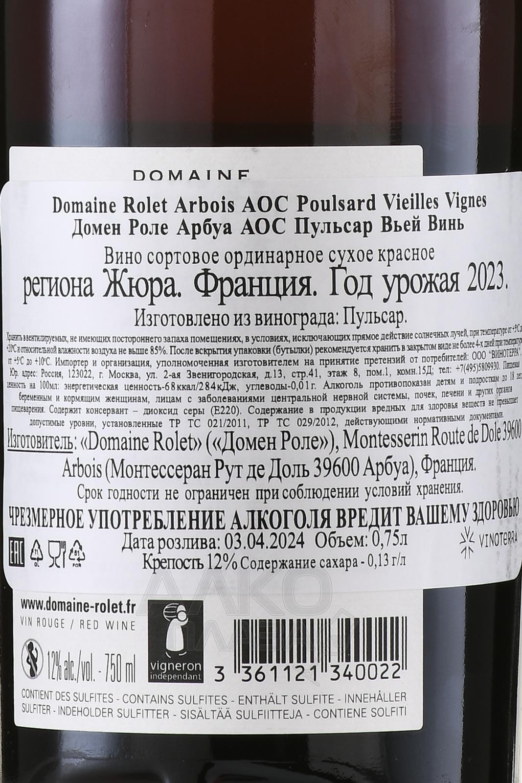 Domaine Rolet, Poulsard Vieilles Vignes Arbois AOC - вино Домен Роле Арбуа АОС Пульсар Вьей Винь 0.75 л красное сухое
