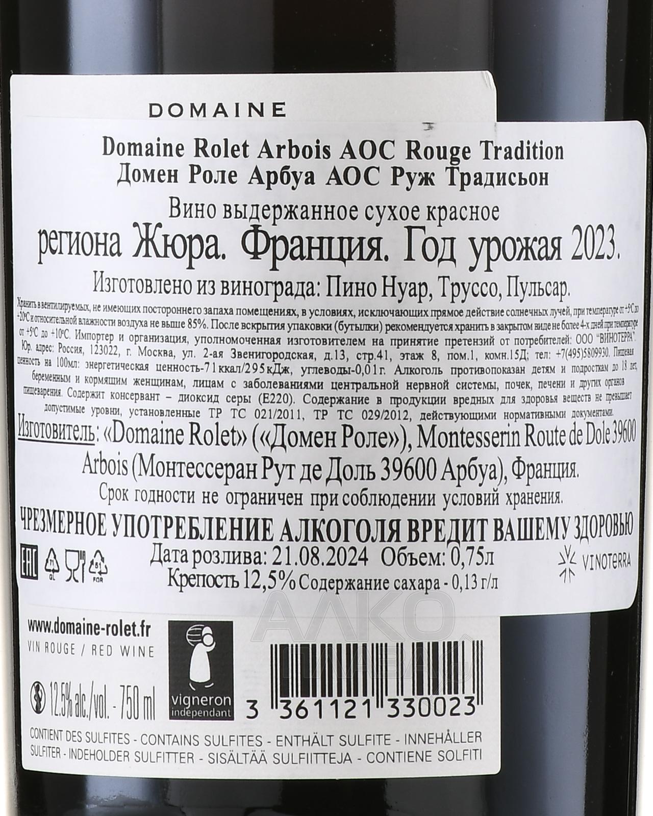 Красное сухое вино Domaine Rolet Tradition Rouge Arbois AOC 0,75 л создано в историческом регионе Жюра, где виноградники расположены на известняковых и мергелевых почвах с хорошим дренажом. Местный климат континентальный, с холодной зимой и теплым летом, что обеспечивает ягодам гармоничное созревание. Урожай собирают вручную, уделяя внимание отбору здоровых гроздей. Брожение проходит традиционным способом в стальных емкостях, после чего напиток выдерживается в дубовых бочках, где приобретает сложность и баланс.
