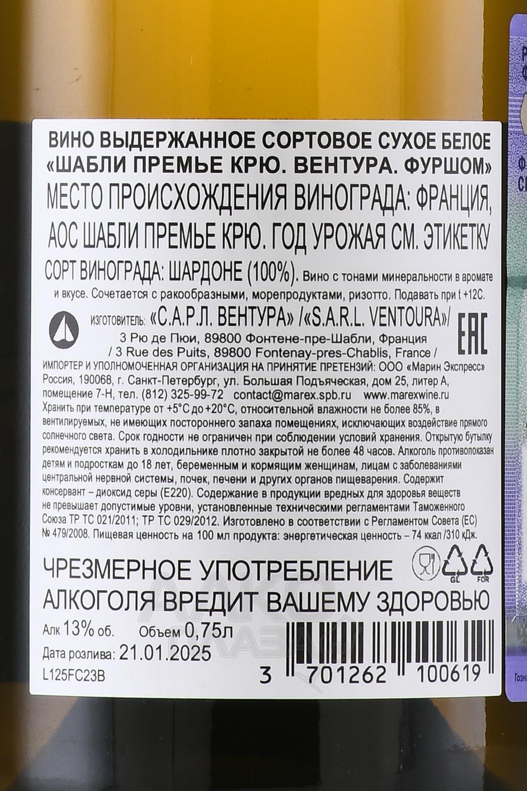 Белое сухое вино Domaine Ventoura Chablis 1-er Cru Fourchaume AOC 2021 г. 0,75 л — сложное и гармоничное по своему характеру Шабли от семейной винодельни Домен Вентура. В ее собственности находится виноградник Премье Крю Фуршом, с которого и получают сырье. Сорт Шардоне растет на меловых почвах, сбор урожая осуществляется ручным способом. Сусло несколько дней отстаивают, затем сливают с осадка и подвергают алкогольной ферментации с местными натуральными дрожжами. Далее следует малолактическое брожение. Вино проходит выдержку в стали 12 месяцев, отдыхает в бетонных емкостях и бутилируется после легкой фильтрации.