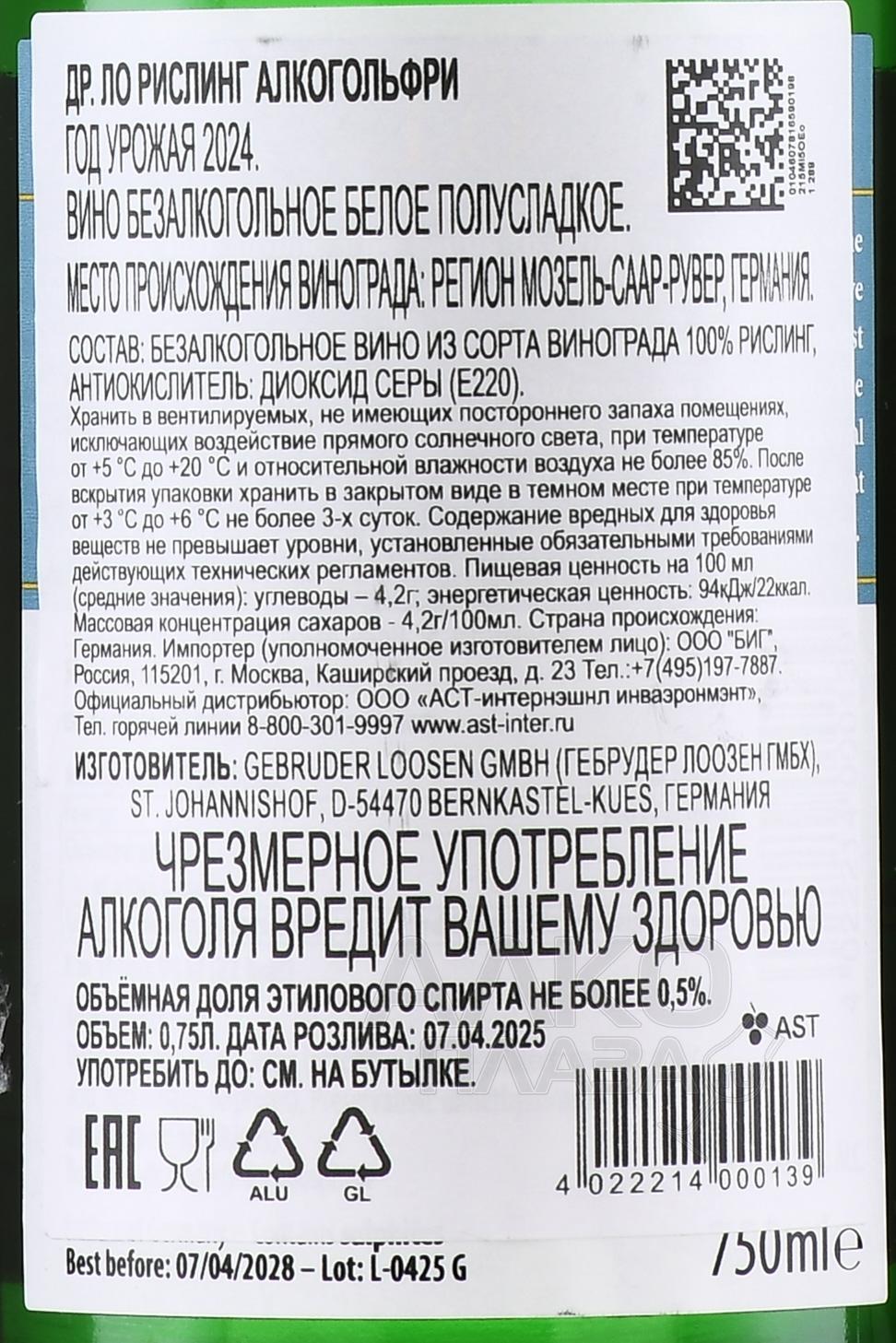 Dr. Lo Riesling Alcohol Free - вино безалкогольное Др. Ло Рислинг 0.75 л белое полусладкое