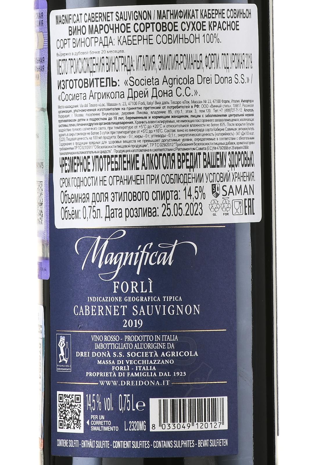Красное сухое вино Drei Dona Magnificat Cabernet Sauvignon 0,75 л из итальянского региона Эмилия-Романья производится исключительно из винограда сорта Каберне Совиньон. Ягоды выращены на собственном винограднике хозяйства площадью около 2 га, расположенном на высоте 155 метров над уровнем моря. Терруар характеризуется южной экспозицией склонов и глинисто-известковой почвой, что способствует оптимальному созреванию плодов. Урожай собирают вручную и тщательно сортируют. Сусло ферментируется при температуре 24–27°C, мацерация длится около 20–23 дней. Затем напиток выдерживают более 20 месяцев во французских дубовых барриках объёмом 225 литров, а после бутилирования – дополнительно дают отдохнуть в бутылках. Среднегодовой объем производства составляет примерно 8900 экземпляров.