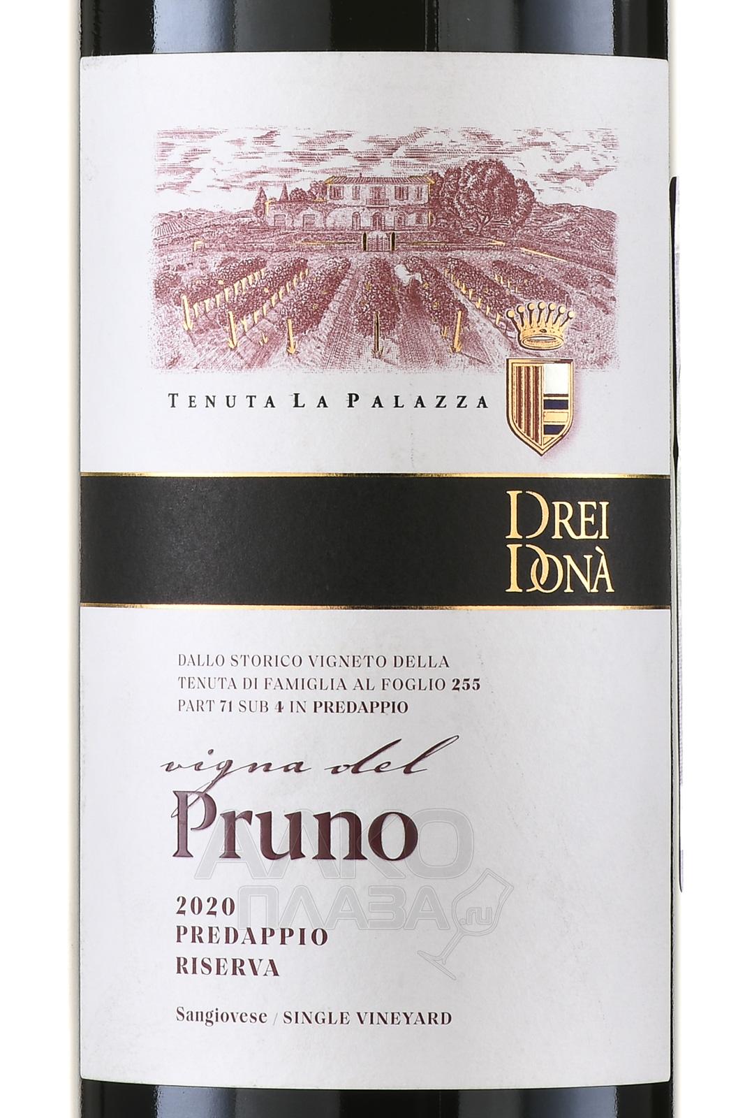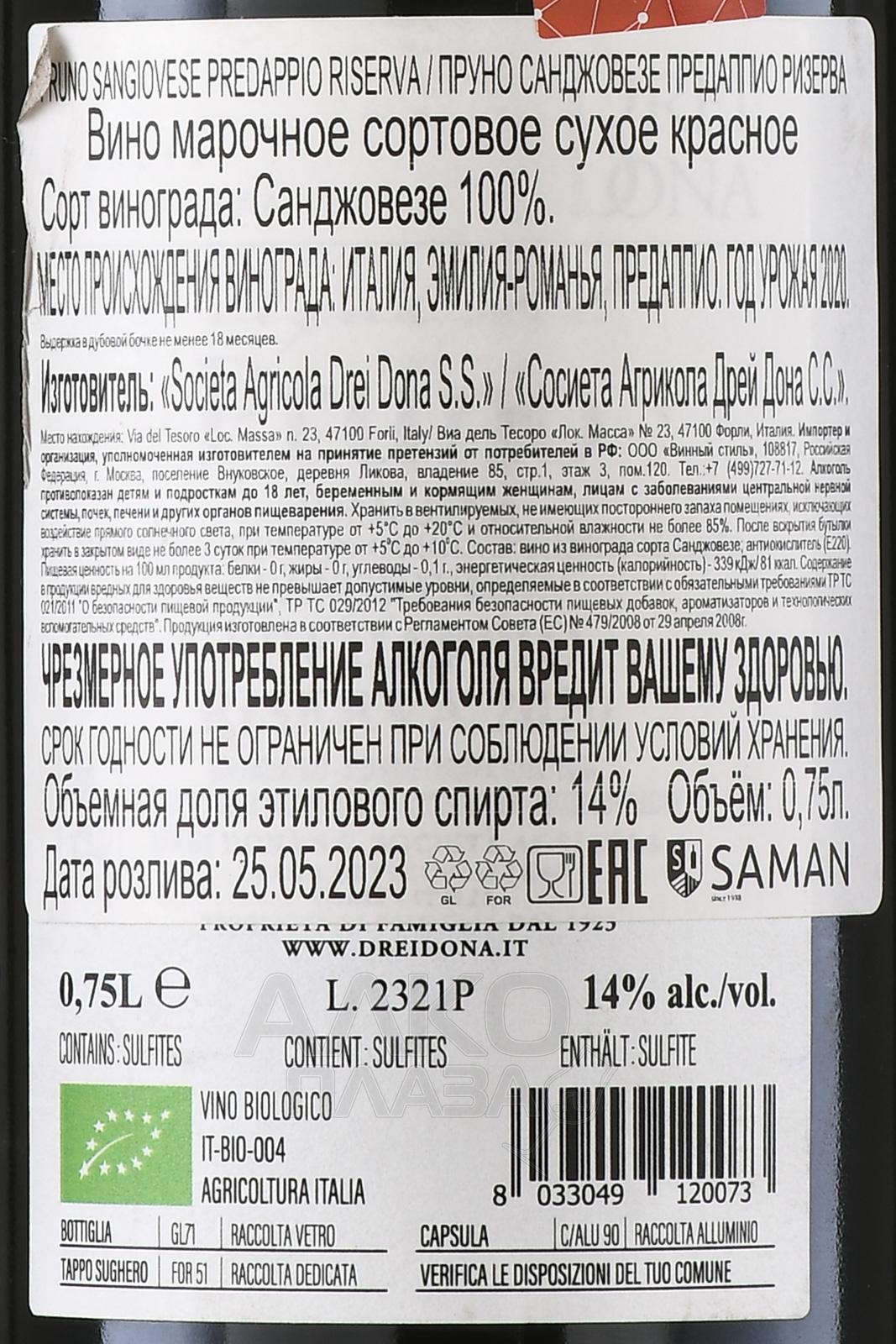 Красное сухое вино Drei Dona Pruno Sangiovese Predappio Riserva 0,75 л — создано из винограда ведущего итальянского сорта, выращенного в зоне Предаппио DOC региона Эмилия-Романья. Терруар характеризуется известково-глинистыми почвами с остатками морских отложений, на холмах высотой от 150 до 300 метров над уровнем моря. Климат сезона сбора урожая был преимущественно солнечным и умеренно влажным, что обеспечило оптимальное созревание ягод и баланс сахаров и кислот. Урожай собирается вручную, затем ферментируется при 24–27 °C с длительной мацерацией на кожице (18–20 дней). Малолактическая ферментация проходит в стальных емкостях и частично в терракотовых амфорах. Выдерживается вино 18 месяцев: 80% — во французских дубовых бочках объёмом 225 и 500 литров, 20% — в амфорах. При бутилировании напиток не фильтруется для сохранения натурального вкуса и структуры.