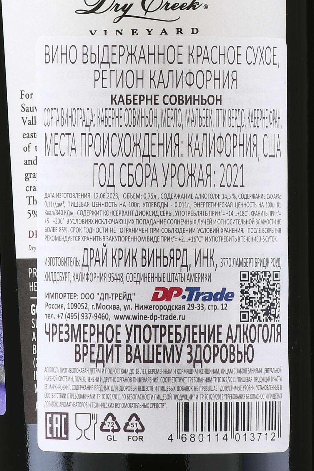 Красное сухое вино Dry Creek Vineyard Cabernet Sauvignon 0,75 л рождено в самом сердце долины Драй Крик, Калифорния, известной своим уникальным терруаром и благоприятным климатом. Почвы здесь каменистые, с хорошим дренажем, а перепады температур между днем и ночью помогают ягодам сохранить баланс между сахаром и кислотностью. Вино произведено из сортов Каберне Совиньон, Мерло, Мальбек, Пти Вердо и Каберне Фран. Ферментация проходила в стальных емкостях при контролируемой температуре не выше 30 °C в течение двух недель. Сусло дважды в день перекачивалось для насыщения кислородом. Затем вино выдерживали 19 месяцев в дубовых бочках из Франции, Венгрии и США, треть из которых — новые. Результатом стал гармоничный, насыщенный купаж с потенциалом выдержки и высокой оценкой у критиков.