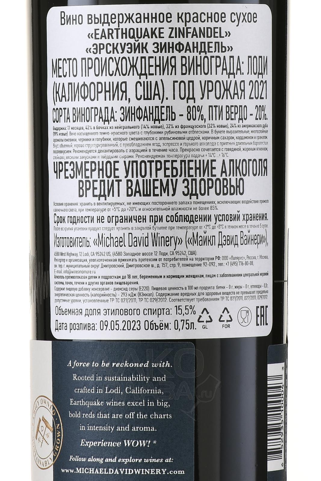 Красное сухое вино Earthquake Zinfandel 0,75 л — яркий пример винодельческого стиля региона Лоди в Калифорнии. Напиток произведен из ягод американсого красного флагманского винограда с добавлением пятой части плодов популярного бордоского сорта. Сырье вырастили на песчано-глинистых почвах в условиях средиземноморского климата с выраженными температурными колебаниями. Лето 2022 года отличалось жаркими днями до +35 °C и прохладными ночами около +15 °C, что способствовало оптимальному созреванию. Средний возраст виноградных лоз — около 30 лет. После сбора виноград достиг показателя зрелости 25 °Bx. В течение 18 месяцев базовое вино выдерживалось в бочках из американского (46%) и французского дуба (14%), остальные 40% сброженного сусла хранили в стальных емкостях.