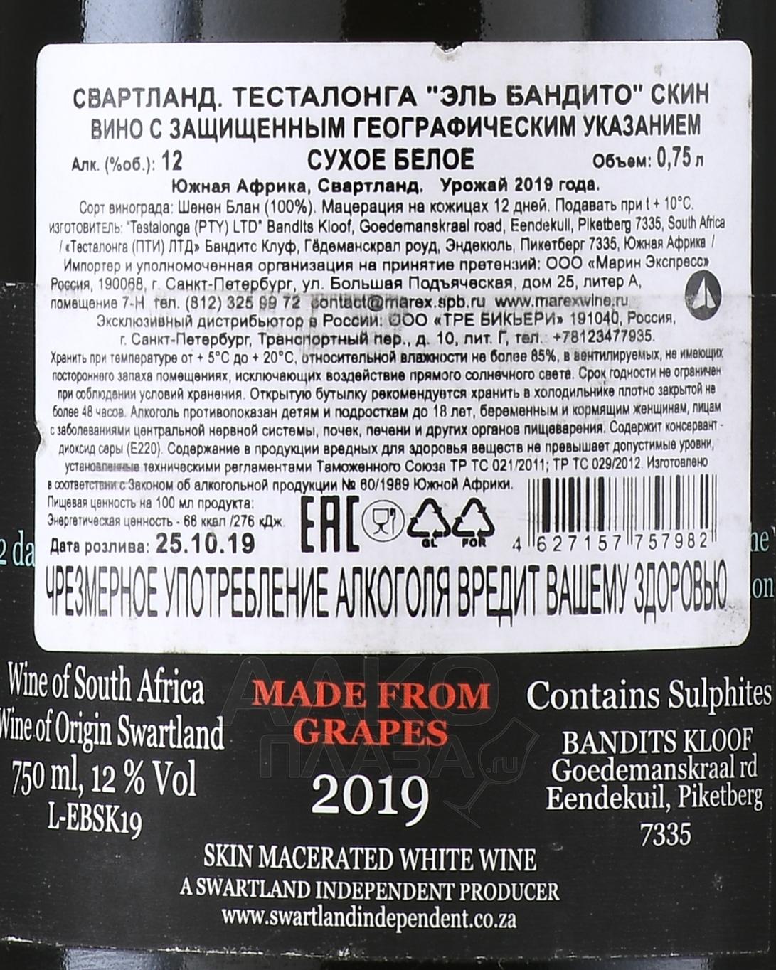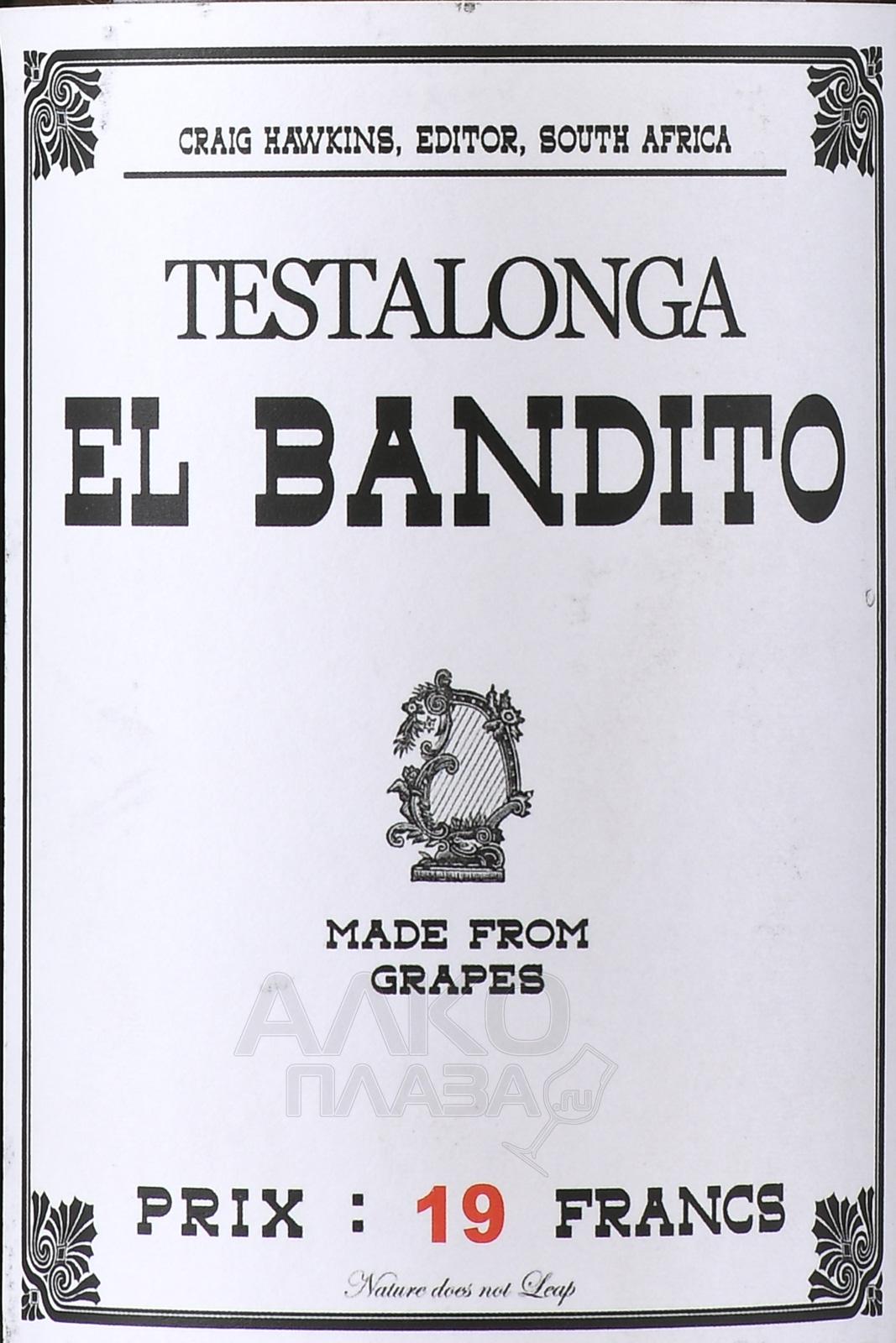 Вино El Bandito белое — сухой органический напиток родом из Южно-Африканской Республики. Его изготовили из экологически чистого винограда Chenin Blanc, собранного в области Свартланд региона Western Cape с 45-летних лоз, произрастающих на высоте порядка 700 м над уровнем моря. Производство 12-градусного напитка осуществилось при минимальном участии человека по классическому методу винификации без применения фильтрации.