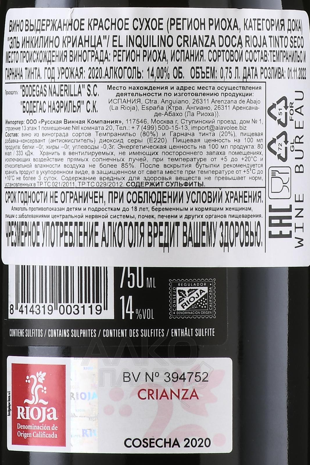 Красное сухое вино El Inquilino Crianza 2020 года 0,75 л — отличным пример современного риоханского стиля. Виноград был вручную со лоз возрастом около 35 лет, растущих на глинисто-известковых почвах в зоне мягкого климата. Урожай 2020 года оказался удачным: умеренные температуры и ровные осадки обеспечили равномерное созревание ягод. 25% гроздей винифицировали целыми, остальную часть сырья отделили от гребней. Ферментация протекала в стальных емкостях, что придало вину выразительный аромат и легкую танинную структуру. Оно выдерживалось 6 месяцев в б/у дубовых бочках объемом 228 и 400 литров, что помогло сохранить чистоту фруктового профиля и добавить легкие древесные ноты. Эль Инкилино Крианца El Inquilino получило высокие оценки за баланс и свежесть, заняв заметное место среди вин Риохи новой волны.