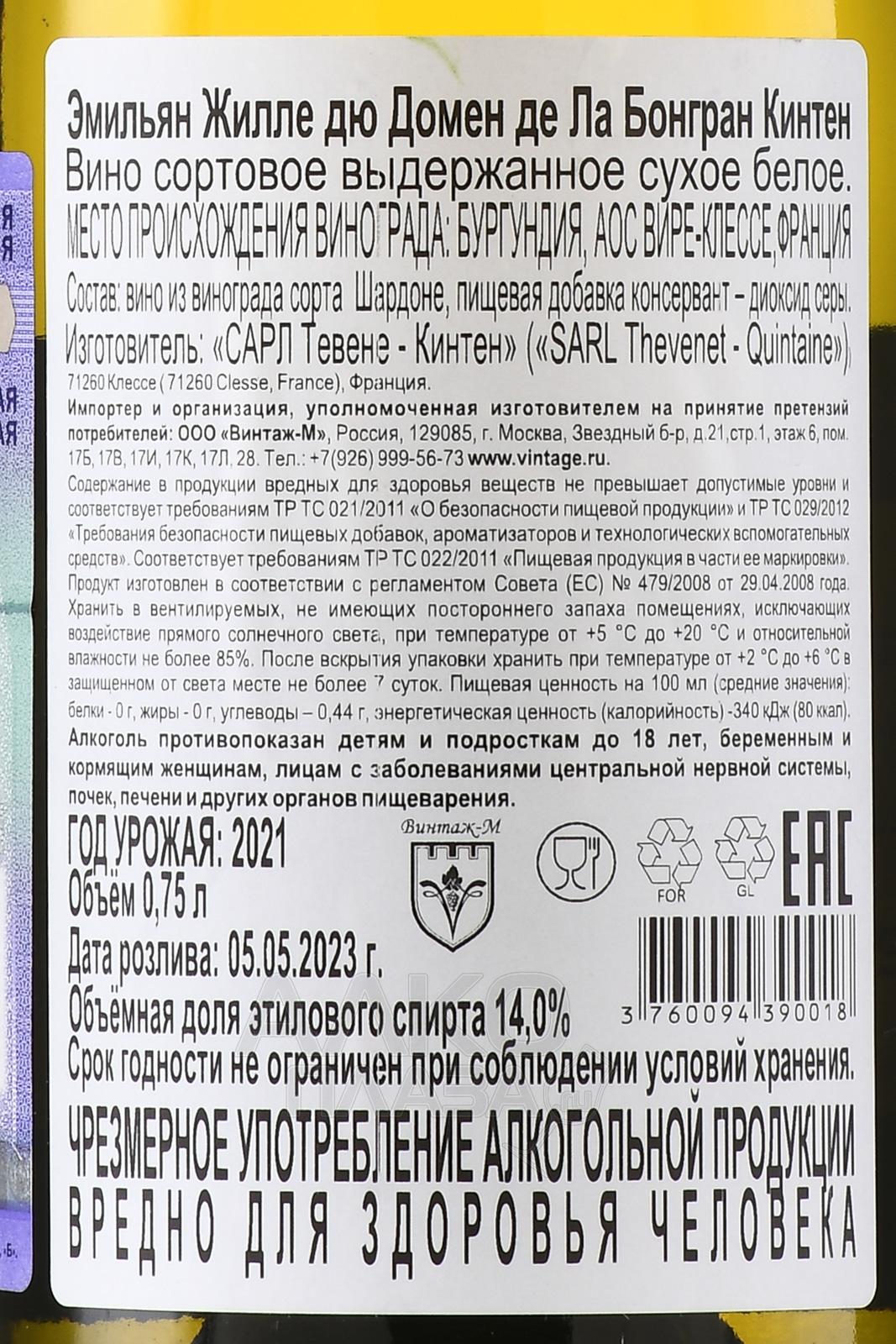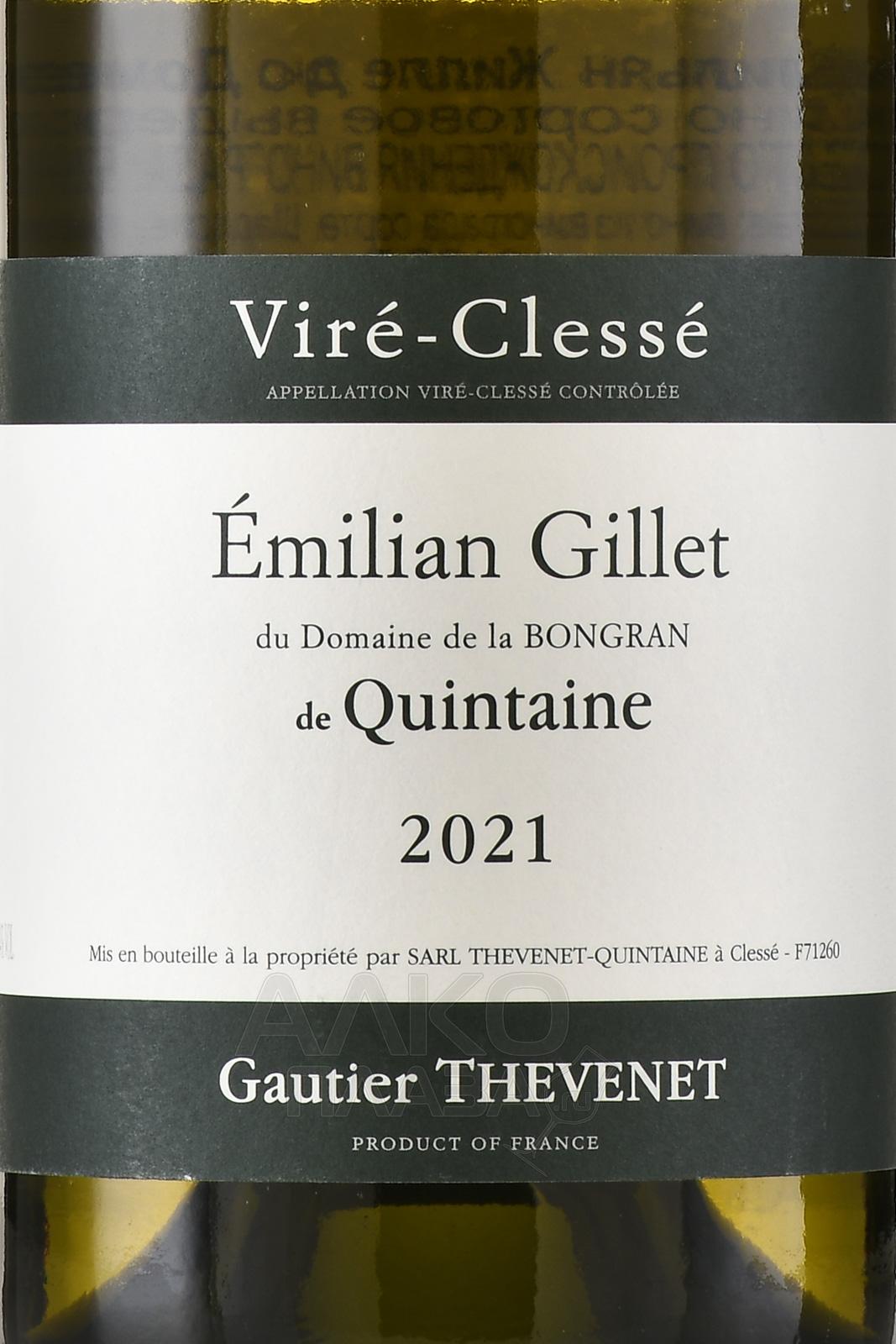 Белое сухое вино Emilian Gillet du Domaine de La Bongran Quintaine 0,75 л — бургундский образец апелласьона Viré-Clessé, созданный из одного сорта и точно отражающий локальный характер. Виноград происходит с участка Кинтен, относящегося к домену, где работают с Шардоне как с единственным источником выражения места. Почвы зоны представлены известняковыми формациями с глинистыми включениями, что формирует сочетание зрелости и минеральной строгости. Урожай винифицирован в традиционном для региона ключе без заявленных экспериментальных методов, с выдержкой на протяжении полутора лет во французском дубе.