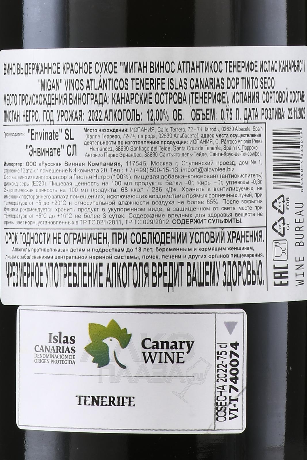 Красное сухое Envinate Migan Vinos Atlanticos Tenerife Canary Islands 0,75 л обладает ярким самобытным характером, поскольку производится из винограда редкого сорта, выращиваемого на острове Тенерифе (Канары), в долине Ла-Оротава. Терруар с красными вулканическими почвами и океаническим климатом формирует уникальный стиль напитка — минеральный, свежий и многослойный. Автохтонный сорт Листан Негро собирали вручную со старых лоз, возраст которых превышает 100 лет. Ферментация проходила естественным образом, с использованием местных дрожжей, часть гроздей винифицировали без гребнеотделения. Выдержка в б/у дубовых бочках длилась 12 месяцев, что придало вину мягкость и структурность без избыточных древесных нот. Оно ценится критиками за баланс, глубину и чистую ароматику, указывающую на вулканический терруар.