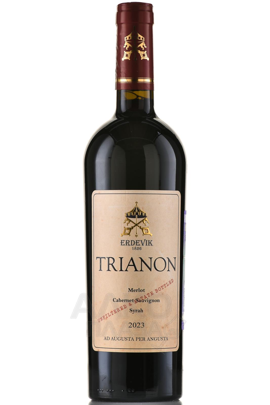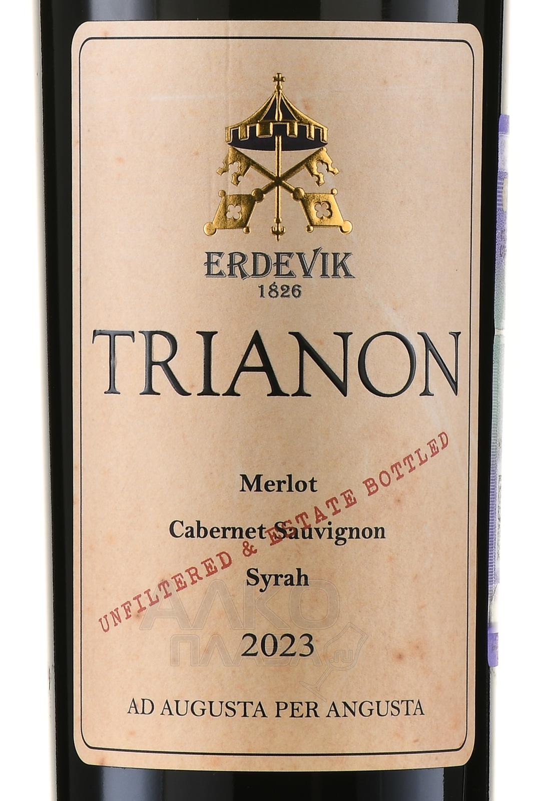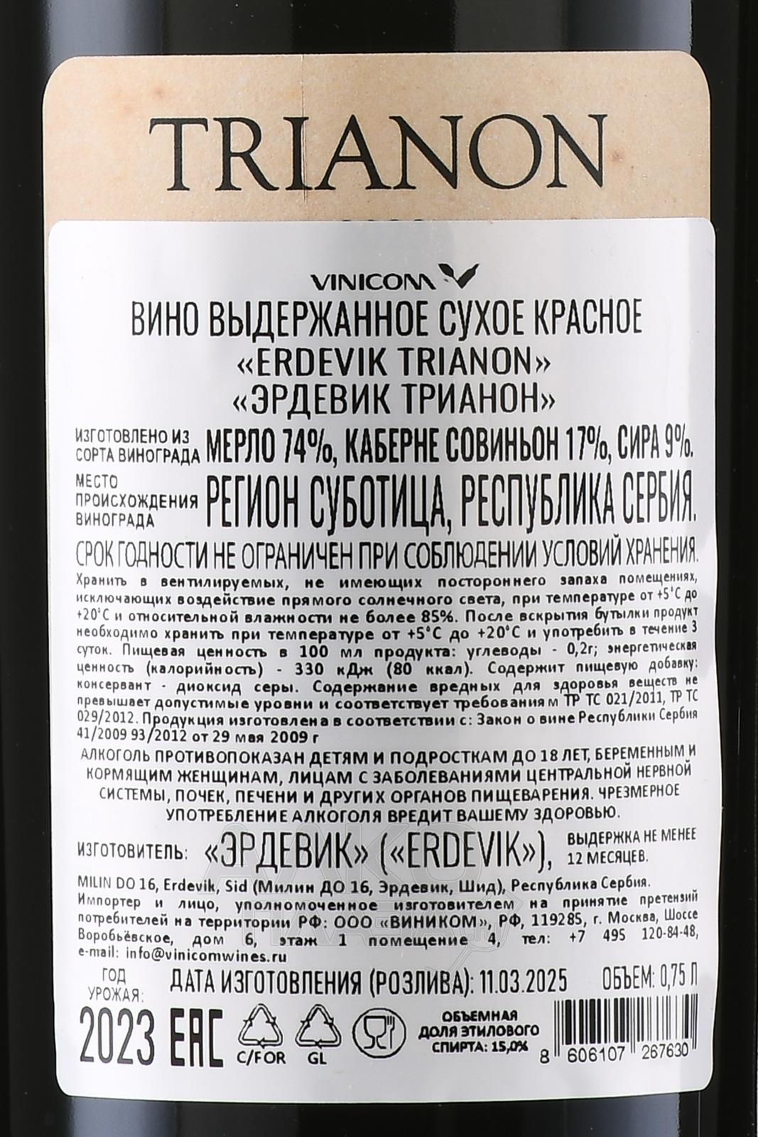 Вино красное сухое Erdevik Trianon 2017 г. 0,75 л – купаж из трех сортов винограда, популярных во всем мире. Урожаи для винификации собрали в один год. Практически весь процесс производства был проведен вручную. Отобранное сырье ферментировали в стальных емкостях, а сусло выдержали в дубовых бочках.