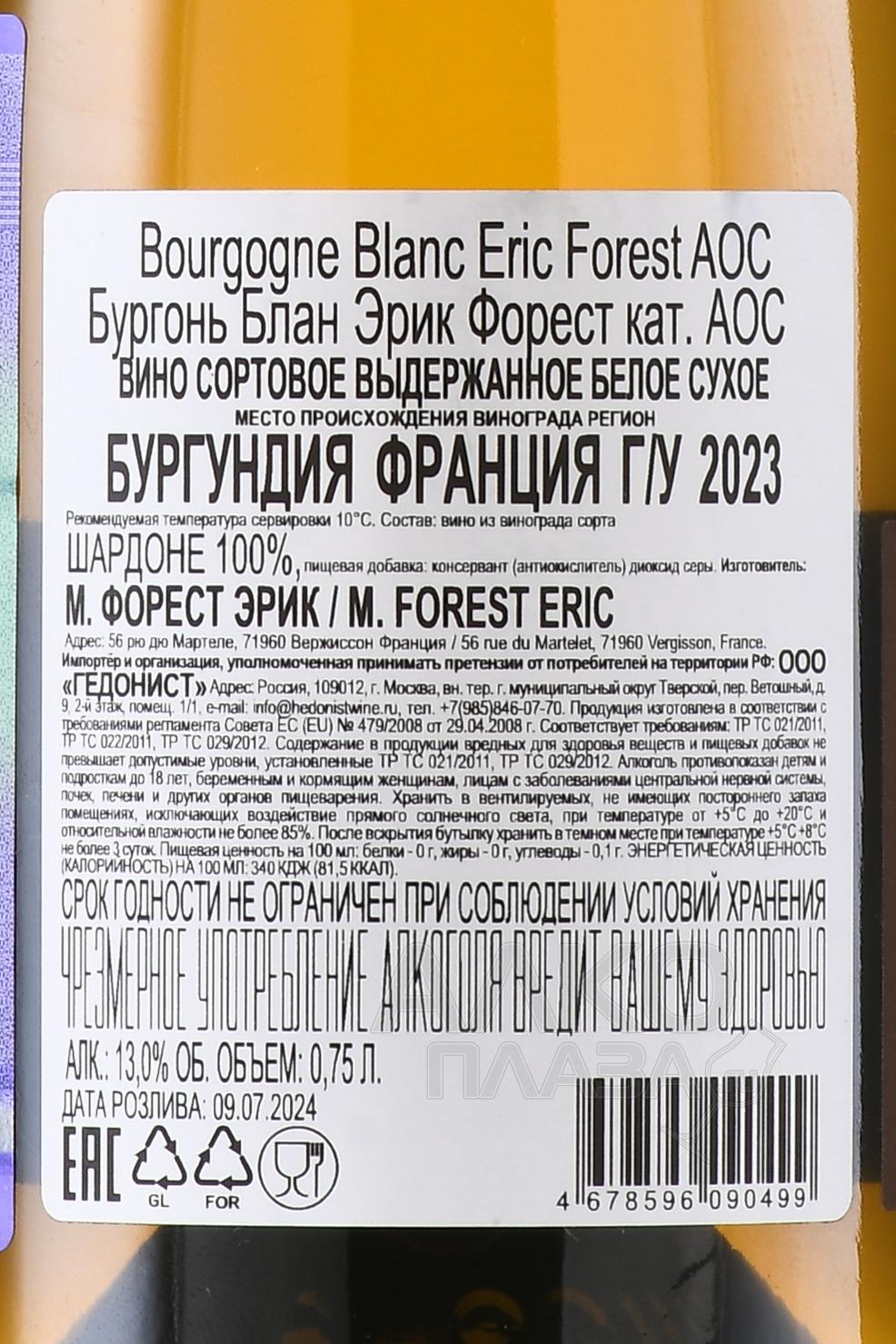 Белое сухое вино Eric Forest Bourgogne Blanc 0,75 л — экземпляр из коллекции бургундского производителя, который работает с небольшими участками, расположенными на высоте 250–300 метров над уровнем моря. Терруар основан на известняковых пластах и глинисто-каменистых почвах, которые дают невысокие урожаи, но формируют плотные ягоды с высоким уровнем естественной кислотности. Лозы имеют солидный возраст, что усиливает концентрацию сока в плодах. Урожай собирают вручную при оптимальной зрелости, затем грозди мягко прессуют с контролем давления для сохранения чистого профиля. Ферментация проходит естественным образом в бочках, без добавления промышленной дрожжевой культуры. Выдержка длится 10–12 месяцев на осадке, что придаёт напитку структурный объём и подчёркивает минеральную основу.