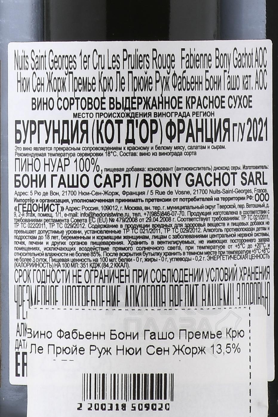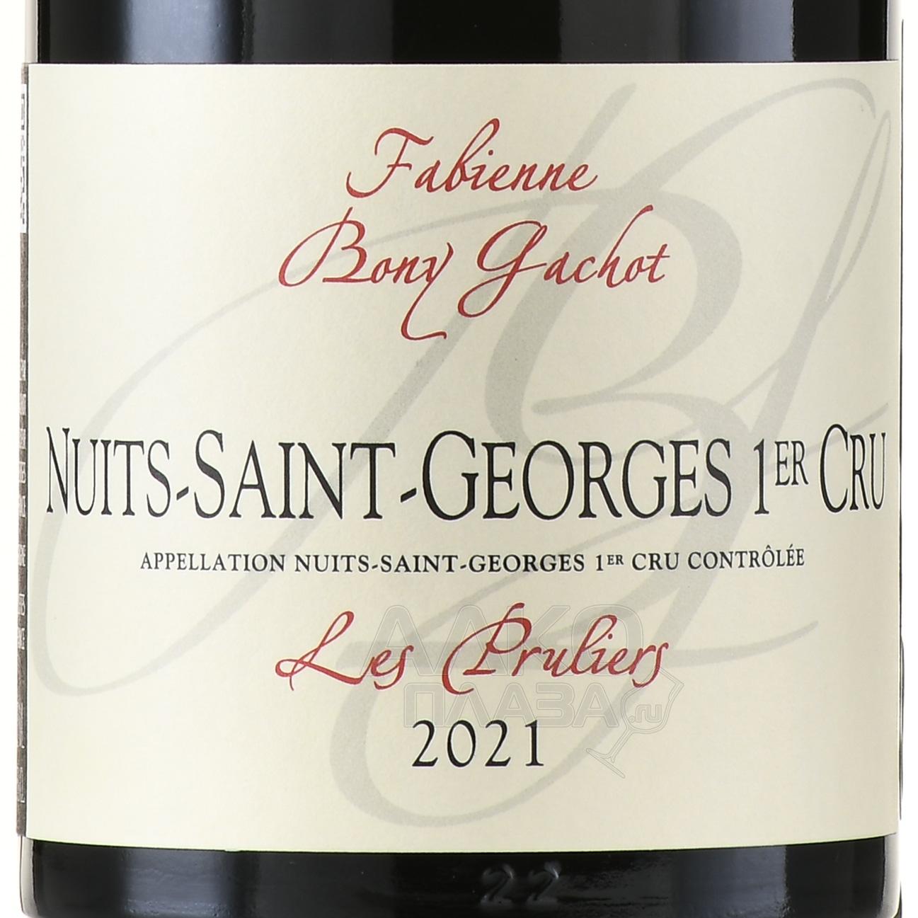 Красное сухое вино Fabienne Bony Gachot 1-er Cru Les Pruliers Rouge Nuits-Saint-Georges 0,75 л создаётся из винограда, который растёт на историческом участке на высоте около 260–290 метров в южной части Нюи-Сен-Жорж. Терруар сложен из плотных известняков, тёмных мергелей и глинистых прослоек, что формирует минимальную урожайность и высокую концентрацию ягод. Лозы имеют зрелый возраст, их корни уходят глубоко в каменистые горизонты, обеспечивая стабильный баланс сока и минеральные нюансы в плодах. Производитель придерживается ручного сбора с двойной сортировкой. Ягоды отправляют на мягкое дробление, ферментация проходит при контролируемых температурах с использованием натуральных дрожжей. Выдержка продолжается 12–14 месяцев в дубовых бочках повторного наполнения.