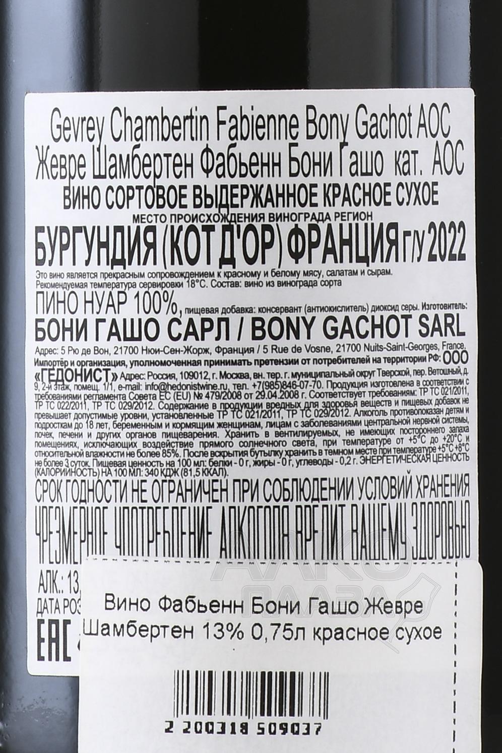 Красное сухое вино Fabienne Bony Gachot Gevrey-Chambertin 0,75 л производится из винограда, который растёт на классических склонах Жевре-Шамбертена. Участки расположены на высоте 260–300 метров. Почвы здесь формируются из известняковых пород с глинисто-мергелевыми слоями, которые дают небольшой урожай с концентрированной органолептикой. Лозы отличаются зрелым возрастом, это дополнительно усиливает характер плодов. Собранный вручную урожай сортируют на месте, затем ягоды отправляют на мягкое дробление. Ферментация идёт дикими дрожжами при контролируемой температуре. Выдержка продолжается примерно 12 месяцев в дубовых бочках разного возраста.