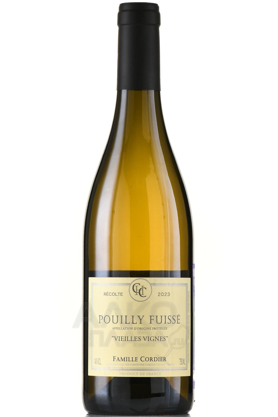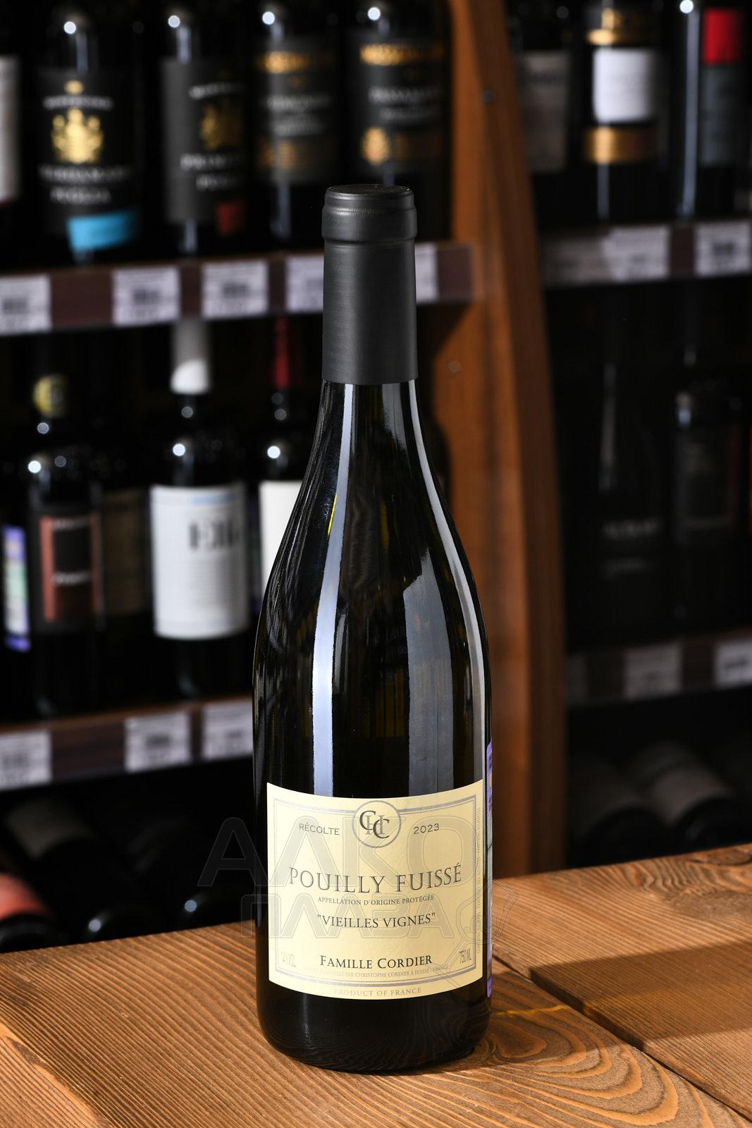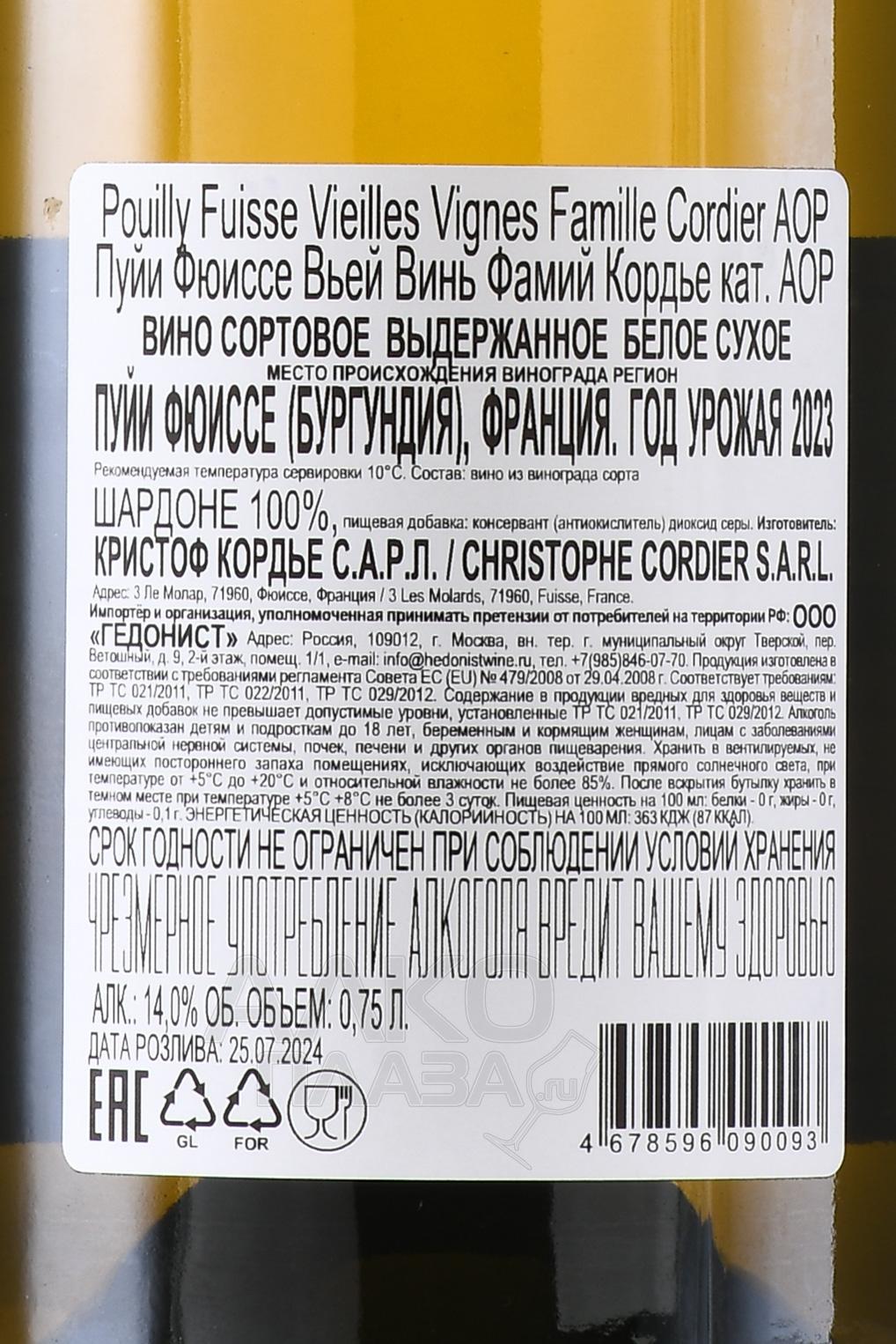 Белое сухое вино Famille Cordier Pouilly Fuisse Vieilles Vignes 0,75 л создаётся из винограда со старых лоз со средним возрастом 60 лет. Плоды собирают рядом с деревнями Фюиссе и Вержиссон на высоте 250–320 метров над уровнем моря. Почвы здесь состоят из глины и известняка, а склоны обращены на восток. Урожайность не превышает 20 гектолитров с гектара. Виноградник сертифицирован по органическим стандартам Ecocert и работает по принципам биодинамики Demeter. Формировка кустов с жёстким прореживанием побегов обеспечивает низкий, но концентрированный урожай. Сбор проводится вручную при полной зрелости ягод. Грозди мягко прессуют, затем сусло под действием гравитационных сил направляется в бочки. Ферментация проходит естественным путём, после чего напиток созревает 12 месяцев в дубовых бочках объёмом 350 литров и ещё полгода — в стальных резервуарах, всё время на полном осадке. Разливают вино по бутылкам без оклейки и с минимальной фильтрацией.
