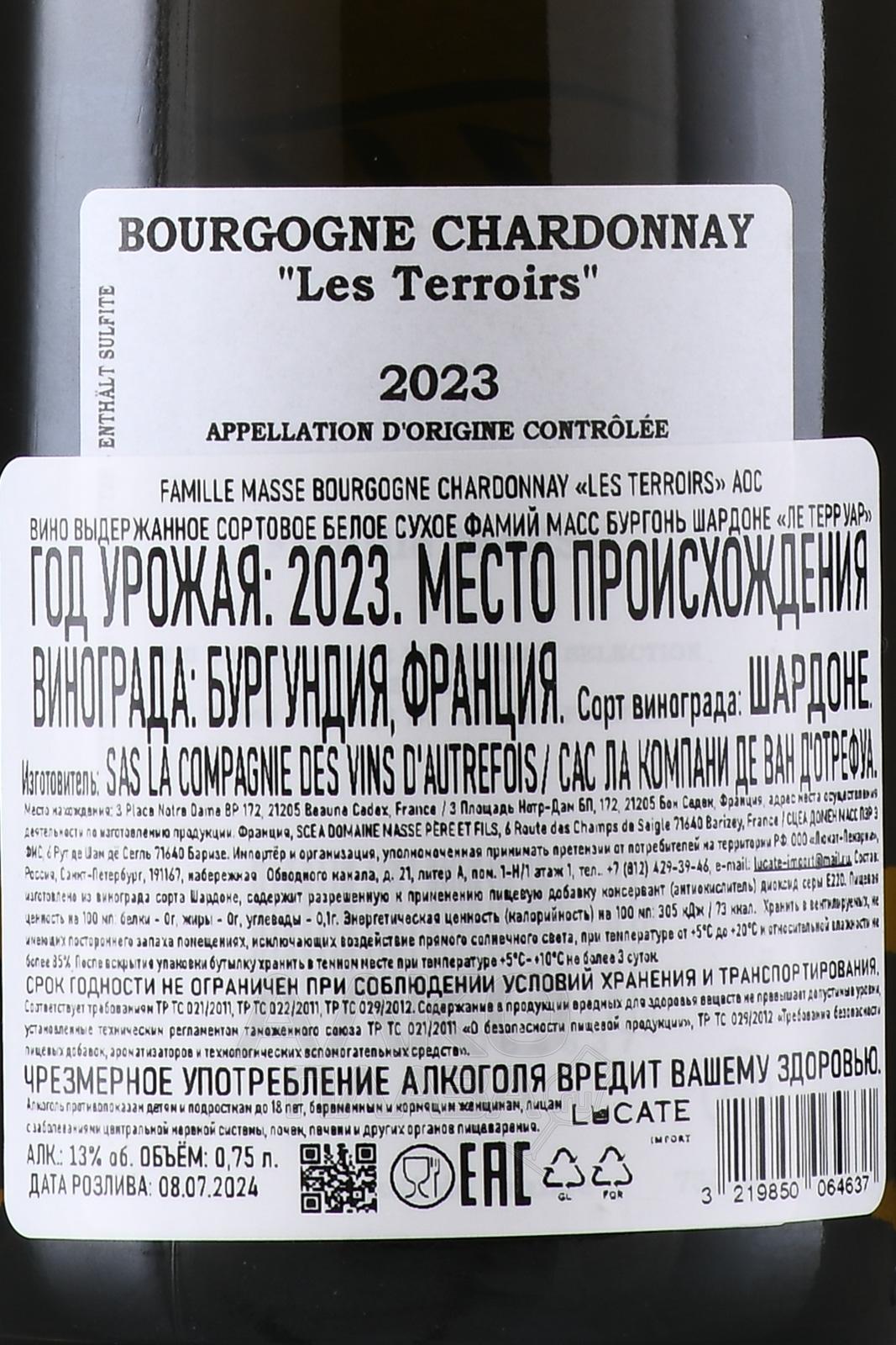 Белое сухое вино Famille Masse Bourgogne Chardonnay Les Terroirs 0,75 л создано в коммунне Баризе, расположенной к востоку от Живри. Виноградники лежат на глинисто-известняковых почвах с высоким содержанием минералов, что придаёт напитку точность и природную свежесть. Виноград собирают небольшими партиями, ягоды прессуют напрямую, сусло осветляют холодом при температуре около 12 градусов. Брожение проходит поровну в бочках и стальных ёмкостях, после чего осуществляется выдержка в течение 10 месяцев. В результате получается аккуратное и элегантное кюве с выражены терруарным характером.