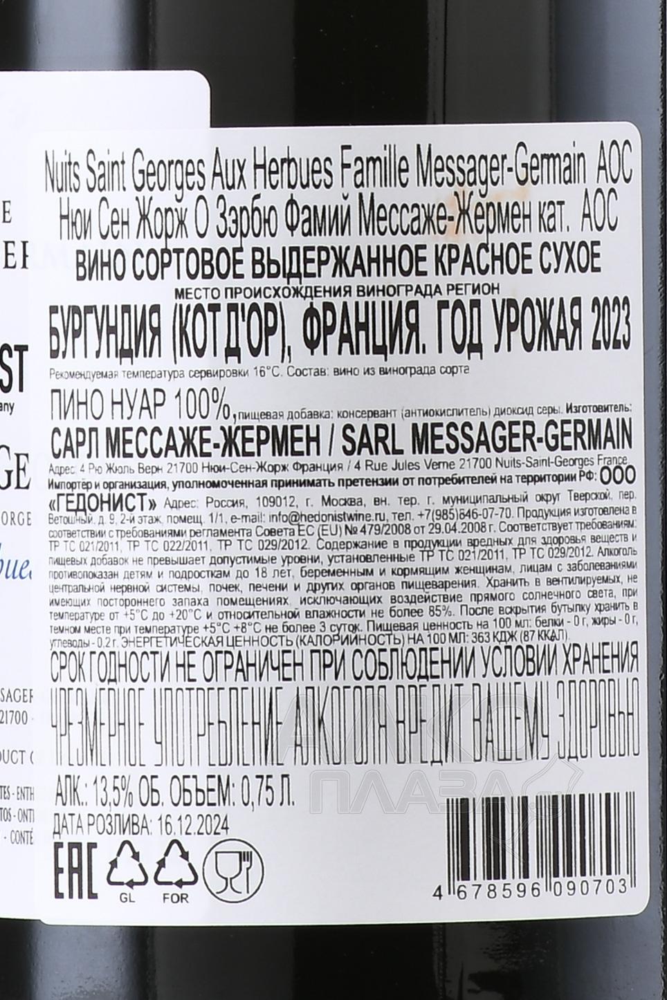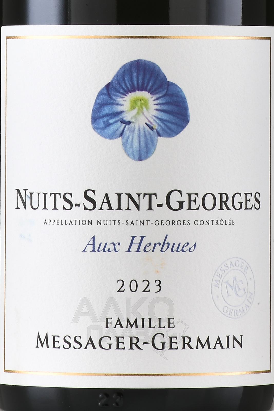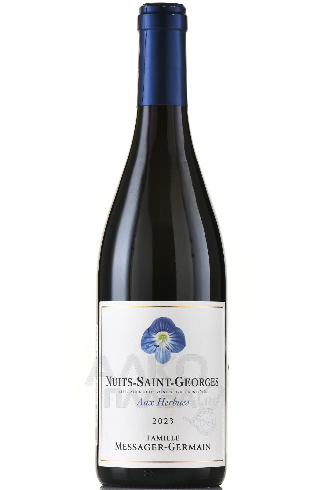 Красное сухое вино Famille Messager-Germain Nuits-Saint-Georges Aux Herbues 0,75 л происходит с северного склона с мергелисто-известняковыми почвами в Нюи-Сен-Жорж. Здесь культивируются лозы со средним возрастом 45 лет. Почва даёт поспевающим плодам плотность и структурность, а утреннее восточное солнце обеспечивает ровное созревание и сохраняет свежесть. Положение у границы с Вон-Романе добавляет тонкую цветочную линию, но стиль остаётся характерным для местного терруара: строгим, выразительным, живым. В винификации используют 30% цельных гроздей. Перед ферментацией проводят холодную мацерацию при 8 °C, которая длится примерно пять дней. Экстракция умеренная: четыре раза проводят пижаж, немного чаще — ремонтаж. Далее идёт выдержка на протяжении 12 месяцев в дубовых бочках, из которых около треть — новые. Фильтрацию перед розливом не применяют. Годовой объём ограничен: около двух тысяч бутылок и тридцать магнумов.