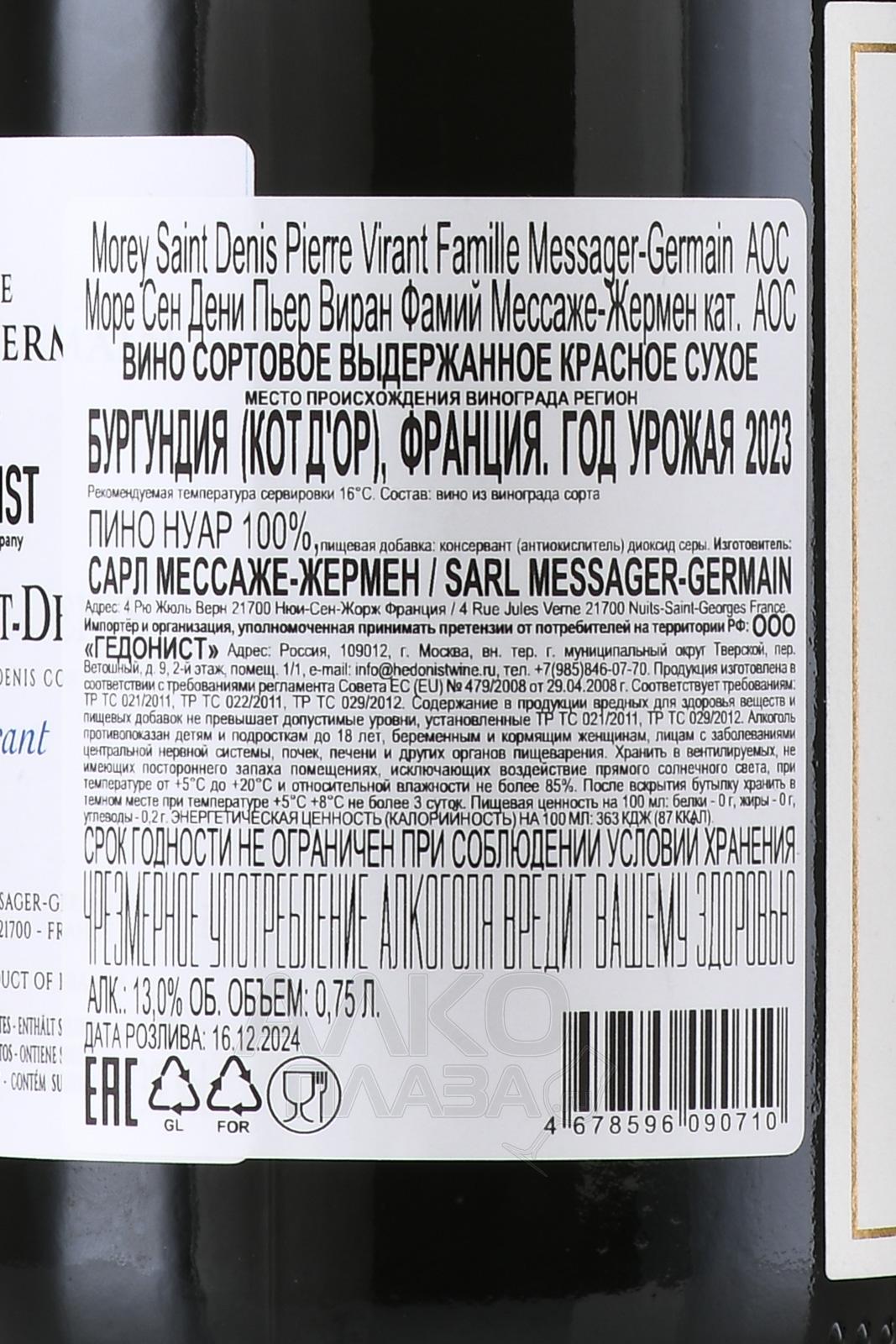 Красное сухое вино Famille Messager-Germain Pierre Virant Morey-Saint-Denis 0,75 л производится в центральной части Кот-де-Нюи в Бургундии. Вино названо в честь исторического участка, расположенного на склонах с восточной и юго-восточной экспозицией, на высоте 240–260 метров над уровнем моря. Терруар представлен сложным сочетанием известняка, мергеля и глинистых прослоек, что характерно для Море-Сен-Дени и формирует более плотный и структурированный стиль по сравнению с соседними коммунами. Умеренно-континентальный климат с прохладными ночами и значительными суточными перепадами температур способствует сохранению кислотности и ароматической чистоты. Семейное хозяйство работает с небольшими участками и придерживается традиционного подхода. Виноград собирают вручную. Алкогольное брожение проходит в чанах с контролем температуры, с умеренной экстракцией. Выдержка осуществляется в бочках из французского дуба от 12 до 18 месяцев, с ограниченной долей нового дерева, чтобы сохранить выражение терруара и сорта.