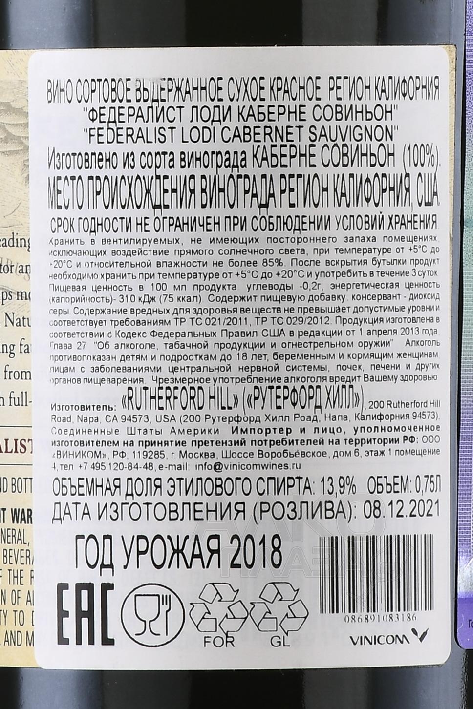 Federalist Lodi Cabernet Sauvignon 0,75 л – красное сухое купажированное вино, в котором основную роль играет Каберне Совиньон. Его глубокий вкус помогают раскрыть ягоды других красных сортов, добавленные в небольшом количестве. Урожай собирают с центрального калифорнийского побережья, в районе Лоди. Партии плодов ферментируются отдельно, чтобы максимально раскрыть вкус каждой составляющей напитка. Сусло контактирует с кожицей в среднем 18 дней. Затем вино выдерживается 15 месяцев в частично новых (35%) дубовых бочках.