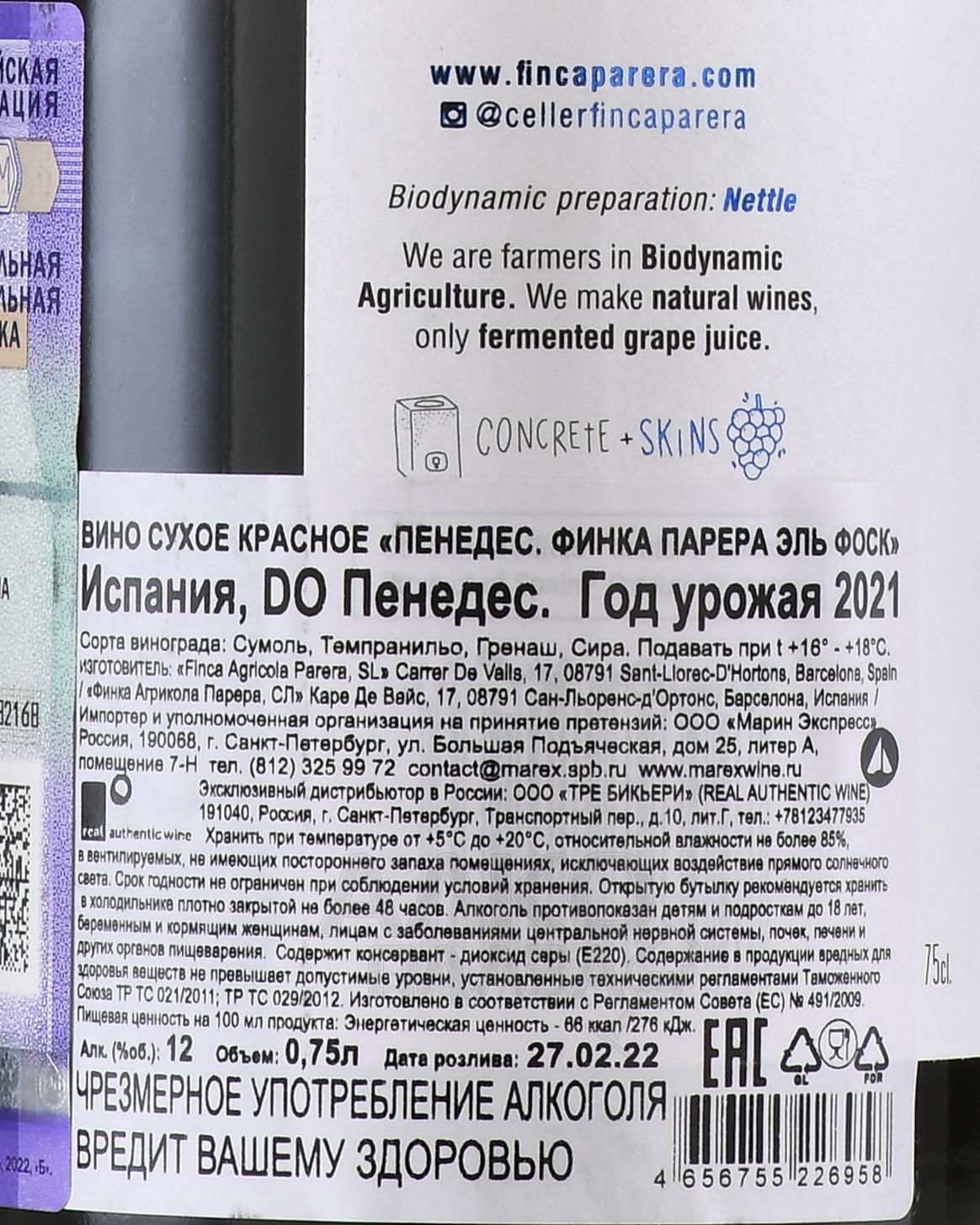 Красное сухое вино Finca Parera El Fosc Penedes 0,75 л создано в одном из самых ярких винодельческих регионов Испании — Пенедес в Каталонии. Хозяйство Финка Парера известно своим биодинамическим подходом, здесь лоза выращивается без использования химических удобрений и с опорой на естественный цикл природы. Урожай винификации собирается вручную, что позволяет отобрать только спелые и здоровые ягоды. Виноградники расположены на высоте около 300 метров над уровнем моря, в почвах, богатых известняком и глиной. Ключевая особенность терруара – контраст между жарким днем и прохладной ночью, что помогает сохранить кислотность и свежесть плодов. В год урожая погодные условия были сбалансированными: теплая весна, сухое лето и отсутствие сильных дождей осенью обеспечили ягодам концентрацию сахаров и фенольных соединений. Ферментация проходила в бетоне и амфорах, что помогло подчеркнуть природный характер напитка, сохранив аутентичность. Созревание осуществлялось без агрессивного влияния дуба, благодаря чему вкус купажа остался чистым и гармоничным.