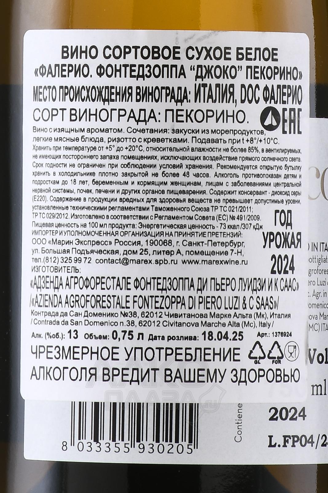 Белое сухое вино Fontezoppa Joco Pecorino 0,75 л производится в Италии, в регионе Марке. Виноградники расположены в холмистой части провинции Мачерата, на высотах, где ощущается влияние Адриатического моря. Почвы здесь преимущественно глинисто-известковые, с хорошей способностью удерживать влагу. Суточные перепады температур способствуют сохранению естественной кислотности и формированию яркого ароматического профиля. Сорт хорошо приспособлен к таким условиям и даёт напитки с выраженной свежестью и структурой. Производство ориентировано на точную работу с сырьём. Сбор урожая проводится при оптимальной зрелости. Ферментация проходит в стальных ёмкостях при контролируемой температуре. Выдержка осуществляется без контакта с древесиной, что позволяет сохранить чистоту сорта и терруарный характер. Производитель подчёркивает биологический подход и минимальное вмешательство в процесс винификации.