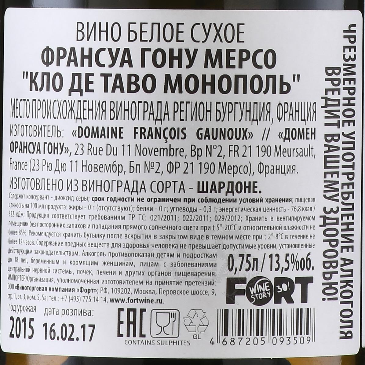 Белое сухое вино Francois Gaunoux Meursault Clos des Tavaux Monopole 0,75 л представляет собой классический образец бургундского стиля с выраженной минеральностью и утонченной структурой. Виноградник Кло де Таво, окруженный стеной и полностью принадлежащий Домену Франсуа Гону расположен на южном склоне Мерсо, где почвы известняково-глинистые и твердые, заставляют лозу сорта Шардоне пускать глубокие корни в поисках влаги. Урожай собирается вручную, ягоды проходят строгий отбор. Ферментация осуществляется в дубовых бочках, часть вина выдерживается на осадке, что обеспечивает его вкусу округлость и сложность. Уникальность заключается в монопольноми статусе виноградника, что делает выпуск Шардоне Франсуа Мерсо Гону Кло де Таво ограниченным и редким. Это вино отмечено положительными отзывами критиков и включается в престижные винные рейтинги.