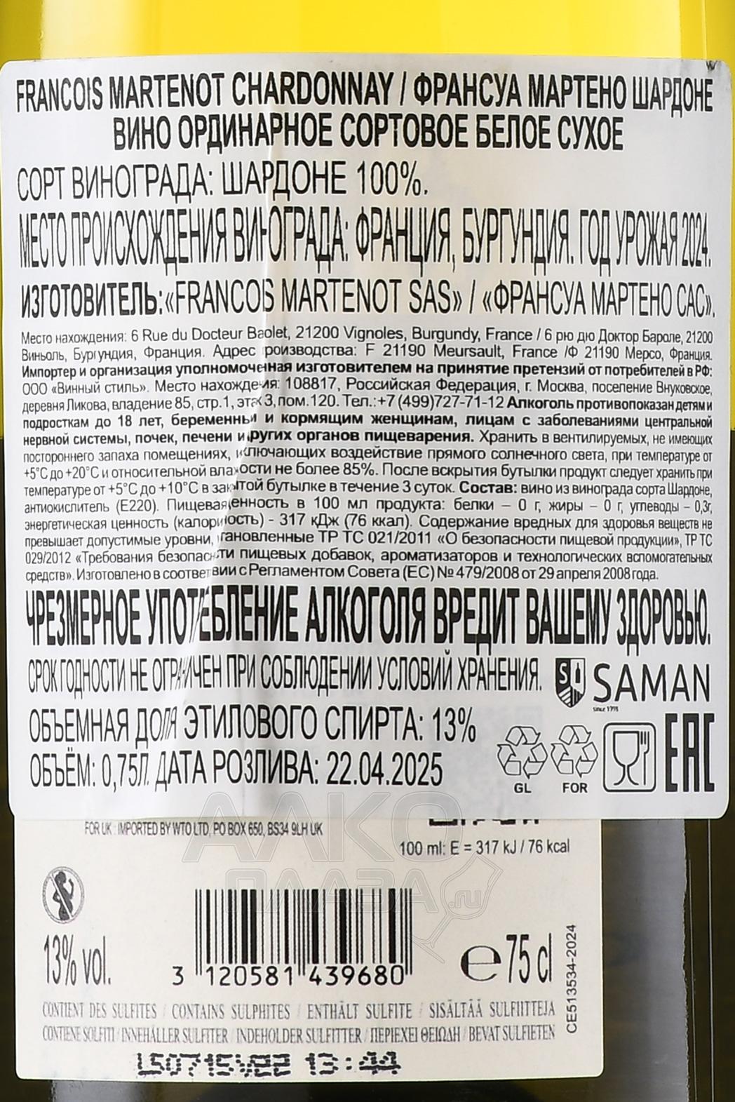 Белое сухое вино Francois Martenot Chardonnay 0,75 л — классический представитель Бургундии, созданный с уважением к традициям французского виноделия. Виноград для этого напитка выращен на холмах с известняково-глинистыми почвами, которые обеспечивают растению идеальный баланс влаги и минералов. Умеренный климaт с прохладными ночами и тёплыми днями позволил ягодам сохранить свежесть и ароматическую концентрацию. Урожай собрали вручную, с последующим мягким прессованием. Ферментация проходила при контролируемой температуре в нержавеющих резервуарах, а кратковременная выдержка на осадке придала напитку округлость и лёгкую сливочность.