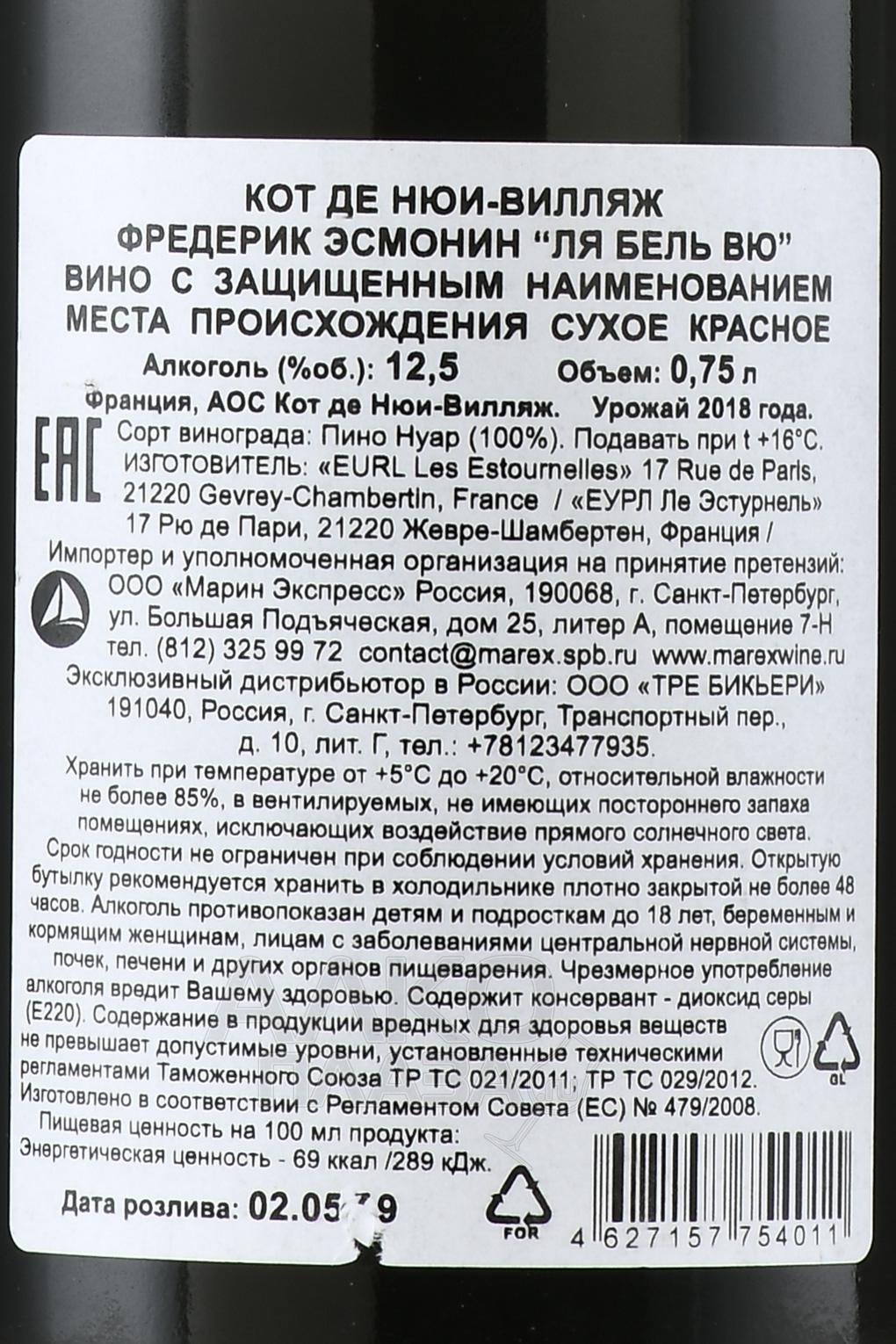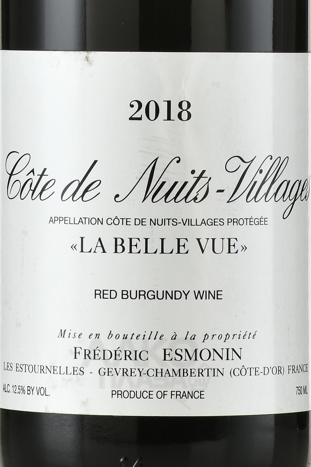 Красное сухое вино Frederic Esmonin Cote de Nuits-Villages La Belle Vue AOC0,75 л изготовлено из сорта Пино Нуар, который выращивается в бургундском апелласьоне Кот де Нюи-Вилляж. Виноградник разбит на солнечном склоне холма, который содержит известняковую породу периода Средней Юры. Хорошо дренируемые почвы, обилие света и контрастный климат с перепадами температур — оптимальные условия для получения качественных урожаев. Виноград собирают вручную, подвергают холодной мацерации, затем сусло ферментируют при контролируемой температуре. Вино выдерживается в старых и новых французских бочках 16 месяцев.
