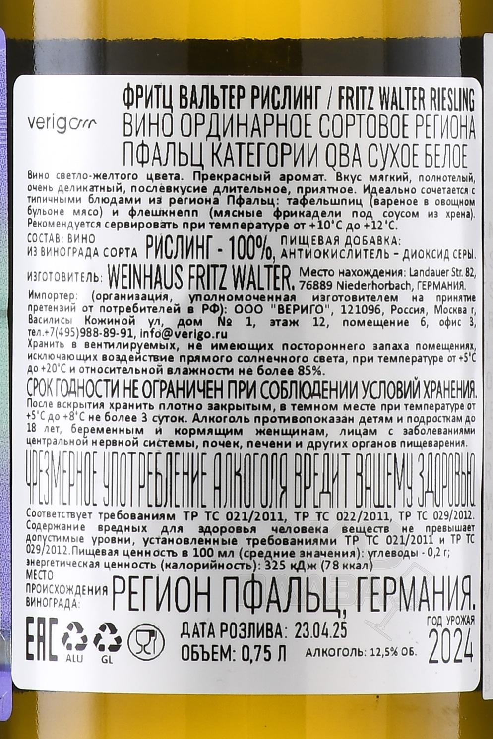 Fritz Walter Riesling 0.75l - белое сухое моносепажное вино из немецкого региона Пфальц.