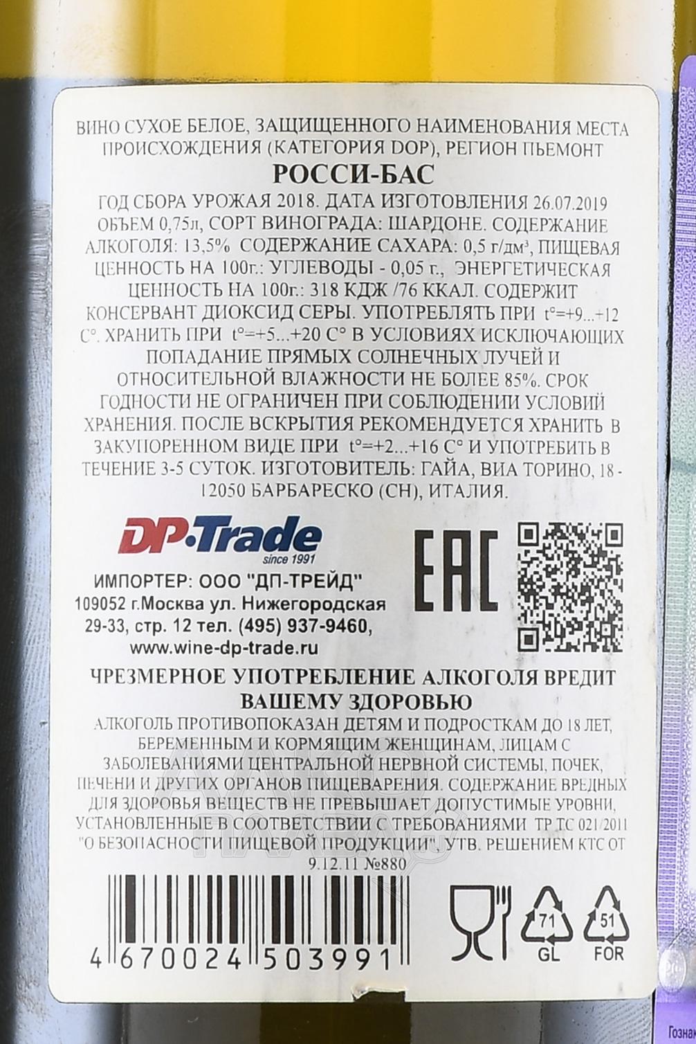 Белое сухое вино Gaja Rossj Bass 0,75 л создается из двух светлых сортов, которые выращиваются на виноградниках Пьемонта. Угодья располагаются в микрозонах Серралунга и Барбареско вдоль холмов, в низинах, что отражено в названии: слово bass с итальянского переводится как «низкий». А Rossj означает Росси — это домашнее имя младшей дочери Анджело Гайя Россаны. Урожай подвергают винификации в стальных чанах на протяжении месяца при температуре 16-18 градусов. Вино выдерживается во французских барриках 6-7 месяцев. Его можно дегустировать в молодом возрасте или оставить дозревать в бутылках на 3-5 лет.