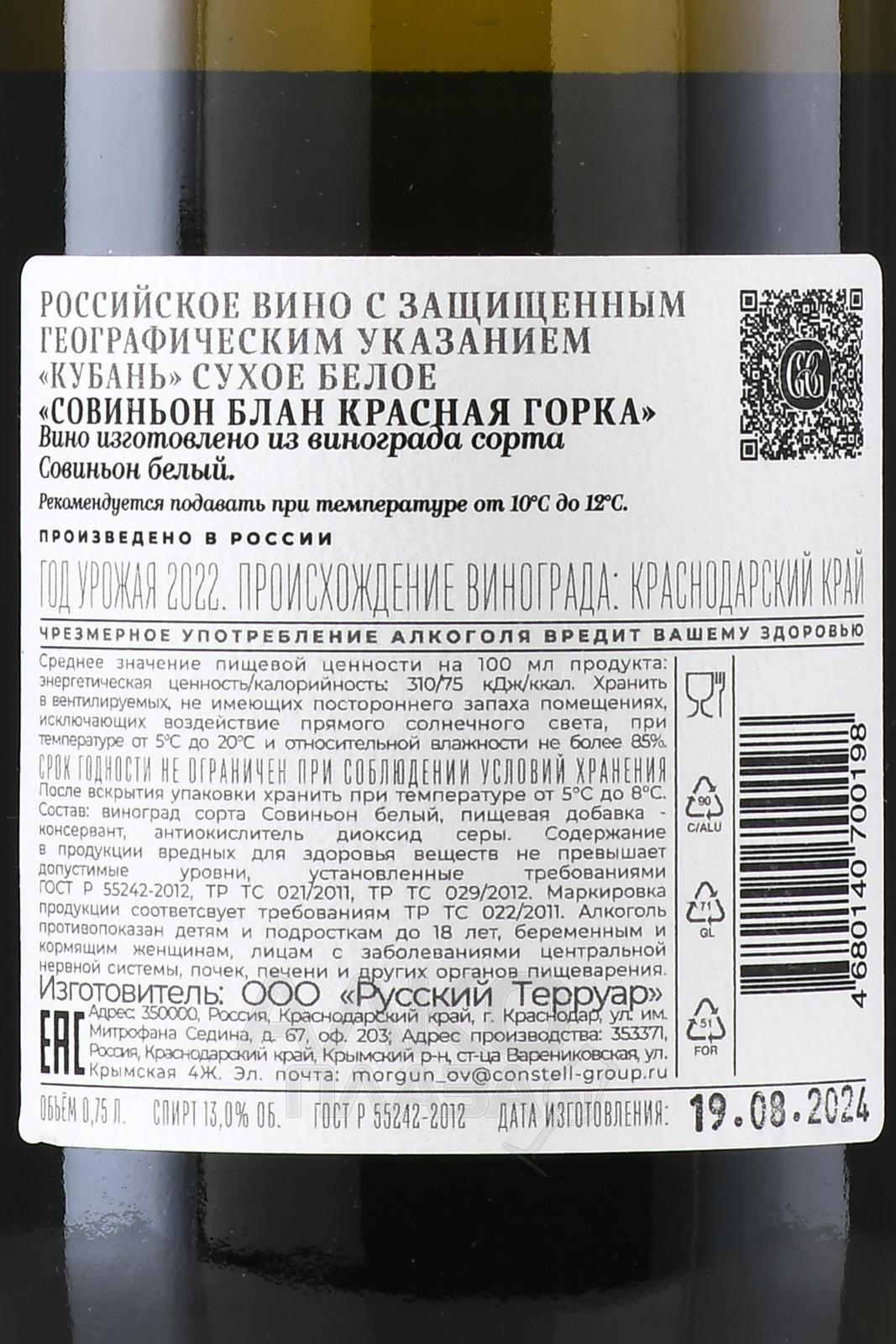 Вино Галицкий и Галицкий Красная Горка Совиньон Блан белое сухое 0.75 л производится в одном из лучших терруаров Краснодарского края. Сырье собирают со старых лоз, которые произрастают в 30 км от побережья Черного моря на высоте примерно 300 м. Сбор ягод осуществляется ручным способом, затем следует этап криомацерации на протяжении 4 часов. Для ферментации используются стальные емкости (60% винограда) и дубовые бочки (40%). Винификация протекает при контролируемой температуре 18-20 градусов 12 дней. После этого вино выдерживается в стальных резервуарах не менее 10 месяцев.