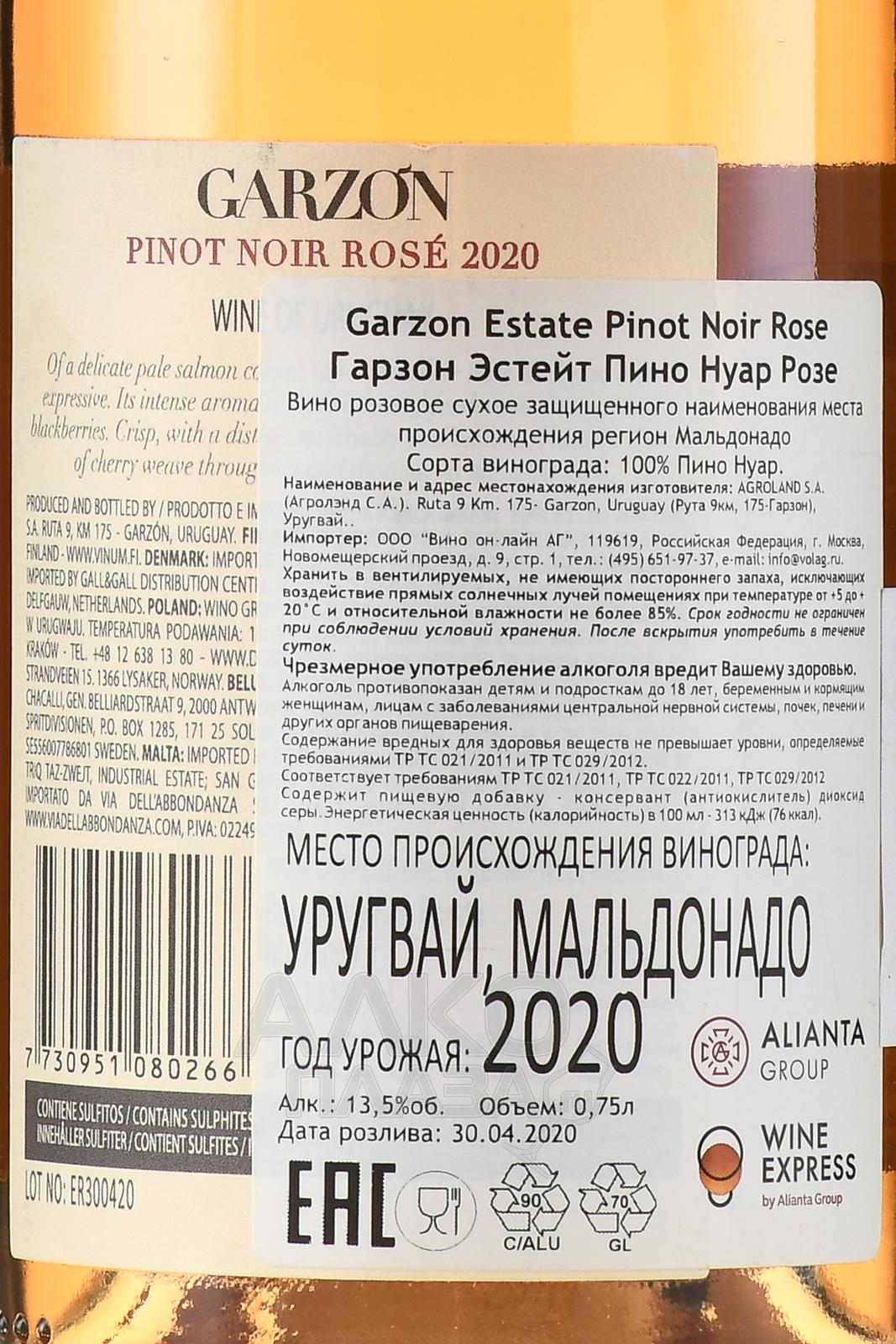 Розовое сухое вино Garzon Estate Pinot Rose De Corte 0,75 л сделано в Уругвае по классической технологии. Для производства использовался сорт Пино Нуар, который выращивался на каменистых, хорошо дренируемых почвах и собирался вручную. После ферментации в цементных резервуарах вино выдерживалось во французских дубовых бочках 12-18 месяцев.