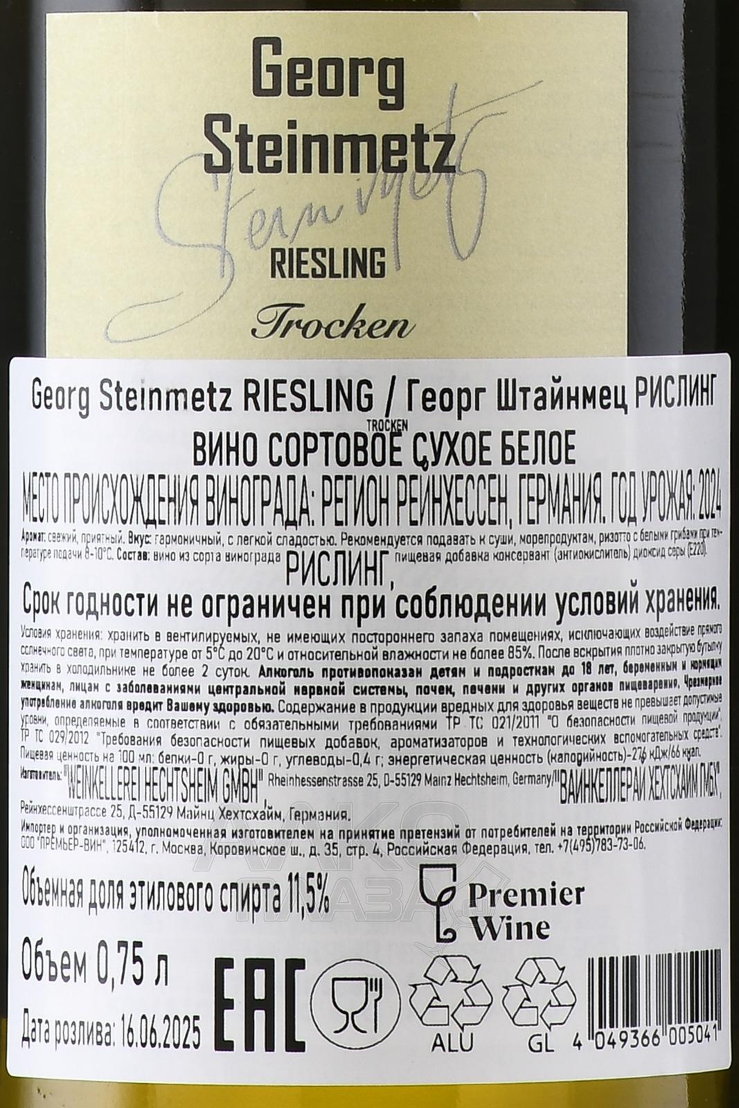 Белое сухое вино Georg Steinmetz Riesling 0,75 л, созданное в строгом соответствии с традициях немецкого виноделия, в полной мере передает уникальный характер региона Рейнгессен. Урожай для него собрали вручную на холмистых угодьях, где господствуют прохладный климат и сланцевые почвы. Виноград Рислинг подвергся пневматическому прессованию — этот метод выбрали для сохранения свежей кислинки и гармоничных минеральных нот. Ферментация осуществилась в стальных емкостях, затем вино непродолжительный срок вызревало в металлических больших баках.