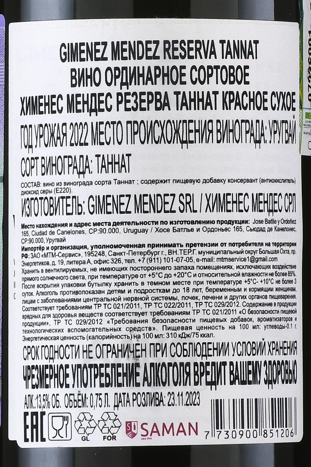 Gimenez Mendez Reserva Tannat - вино Хименес Мендес Резерва Таннат 0.75 л красное сухое