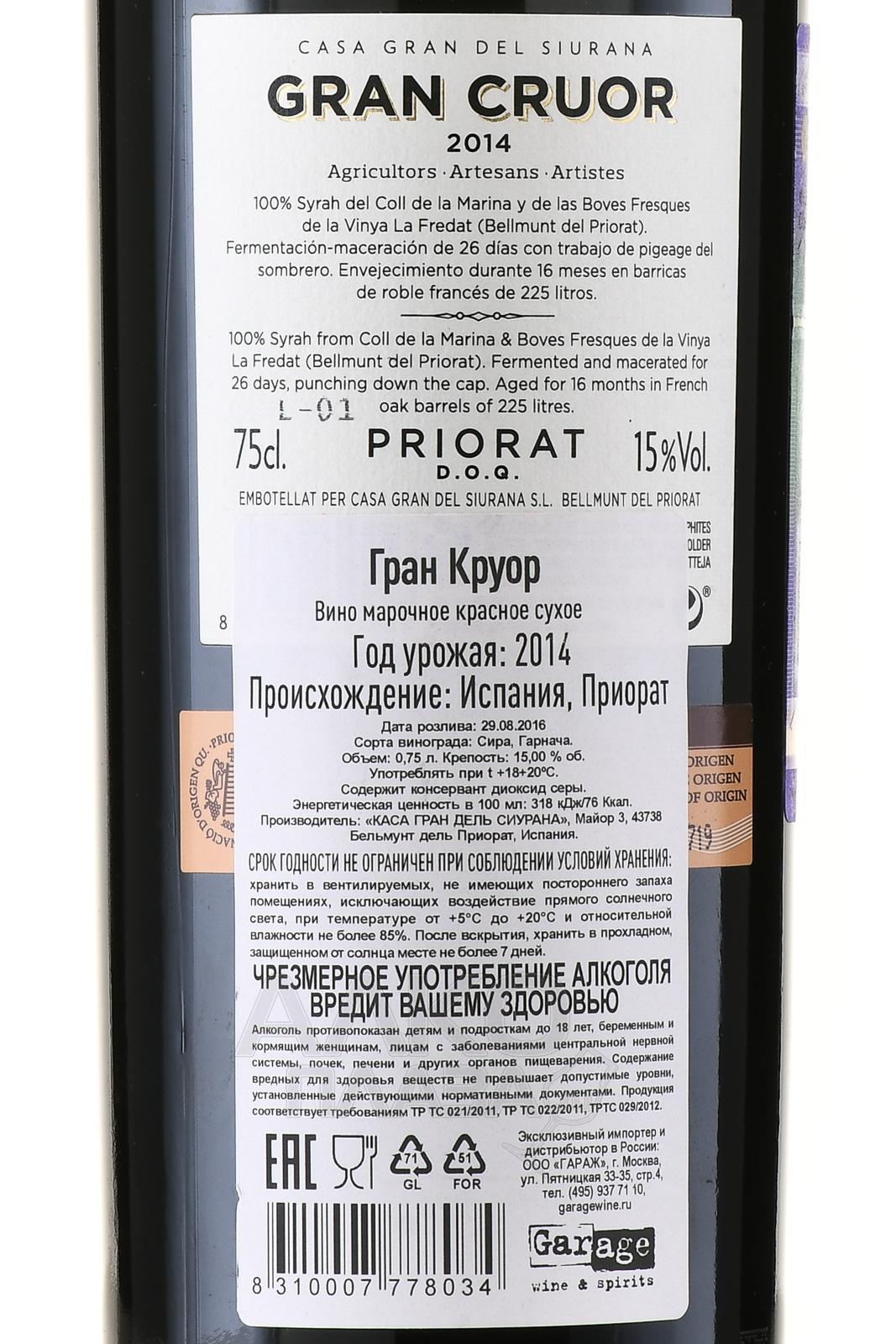 Вино Gran Cruor красное сухое производится из винограда, выращенного в Каталонии в винодельческой зоне категории DOC - Приорат. Почвы на винограднике, на котором высажены лозы, вулканического происхождения. Собранный вручную урожай доставляется на винодельню, сортируется, прессуется, дробится, после чего происходит процесс выдержки сусла на мезге. Длится она на протяжении 30 дней с ежедневным пижажем. Выдерживается вино в течение 1.5 лет в новых французских бочках.