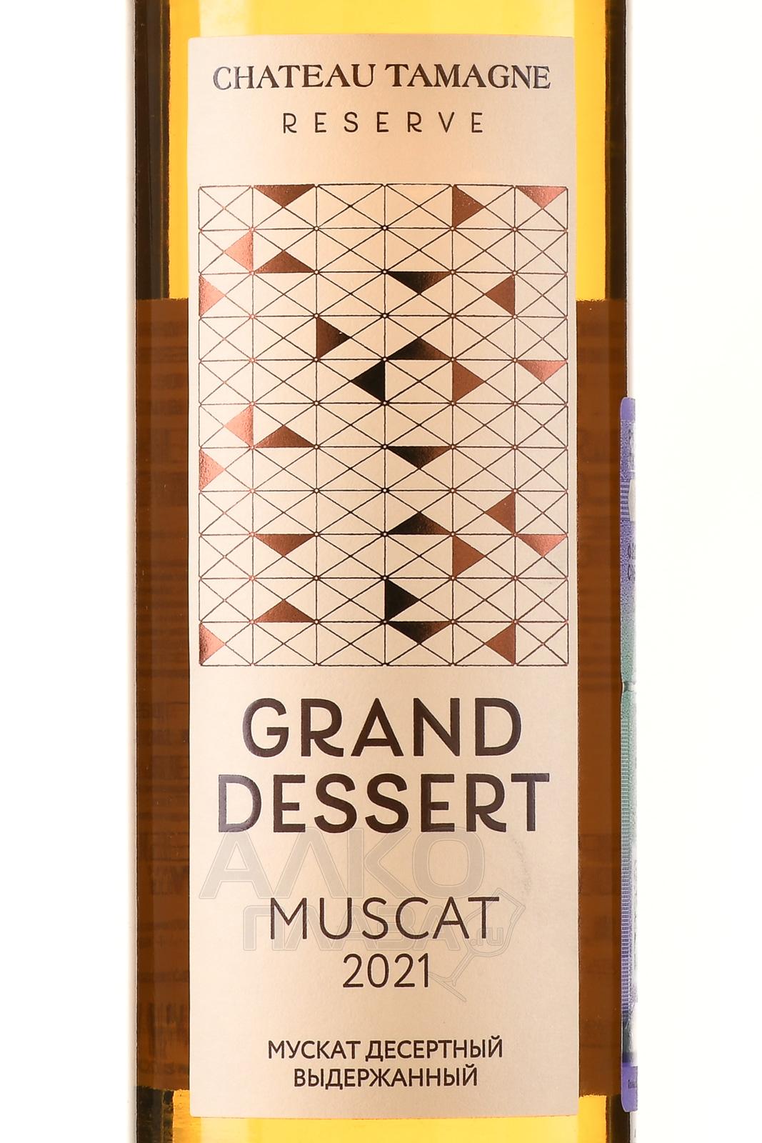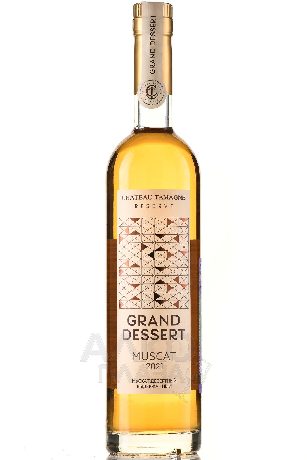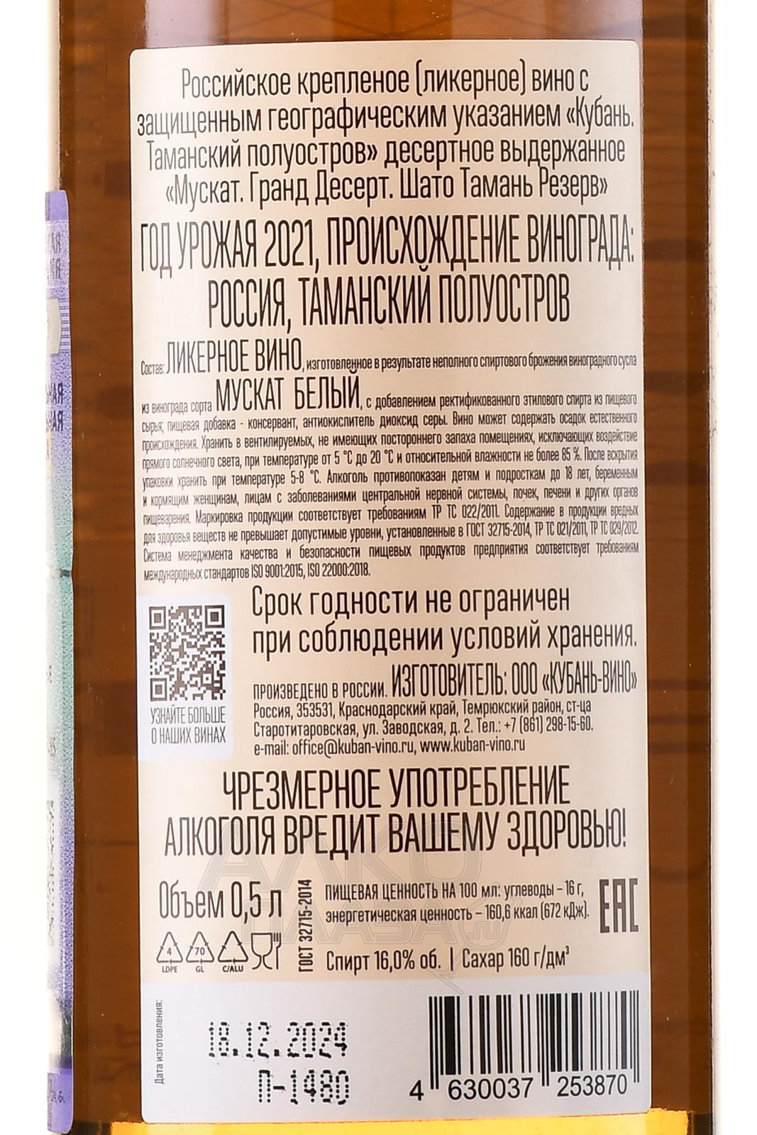 Вино Шато Тамань Резерв Гранд Десерт Мускат — высококачественный белый алкоголь сладкой категории, произведенный в России из винограда Мускат с угодий Таманского полуострова. Ягоды собрали с 13-летних лоз и подвергли мацерации с мезгой, а затем сбраживанию. Этот процесс остановили посредством добавления небольшого количества зернового ректификата, что позволило повысить крепость до 16% и сохранить уровень сахара на отметке в 160 г/л. Перед розливом по бутылкам 500 мл вино прошло вызревание в барриках из древесины кавказского дуба на протяжении полутора лет.