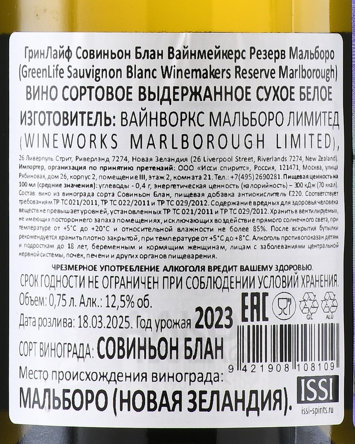 Белое сухое вино GreenLife Sauvignon Blanc Winemakers Reserve 0,75 л относится к линейке, ориентированной на чистое выражение сорта и аккуратную работу с сырьём. Напиток создан из тщательно отобранного винограда, собранного при технологической зрелости, с последующей холодной ферментацией. Производитель позиционирует стиль релиза как современный и гастрономичный. Основной акцент сделан на сортовую ароматику, прямую структуру и чистоту вкуса без усложняющих техник. Категория Winemakers Reserve указывает на выборочные партии и повышенное внимание к контролю качества на этапах винификации.