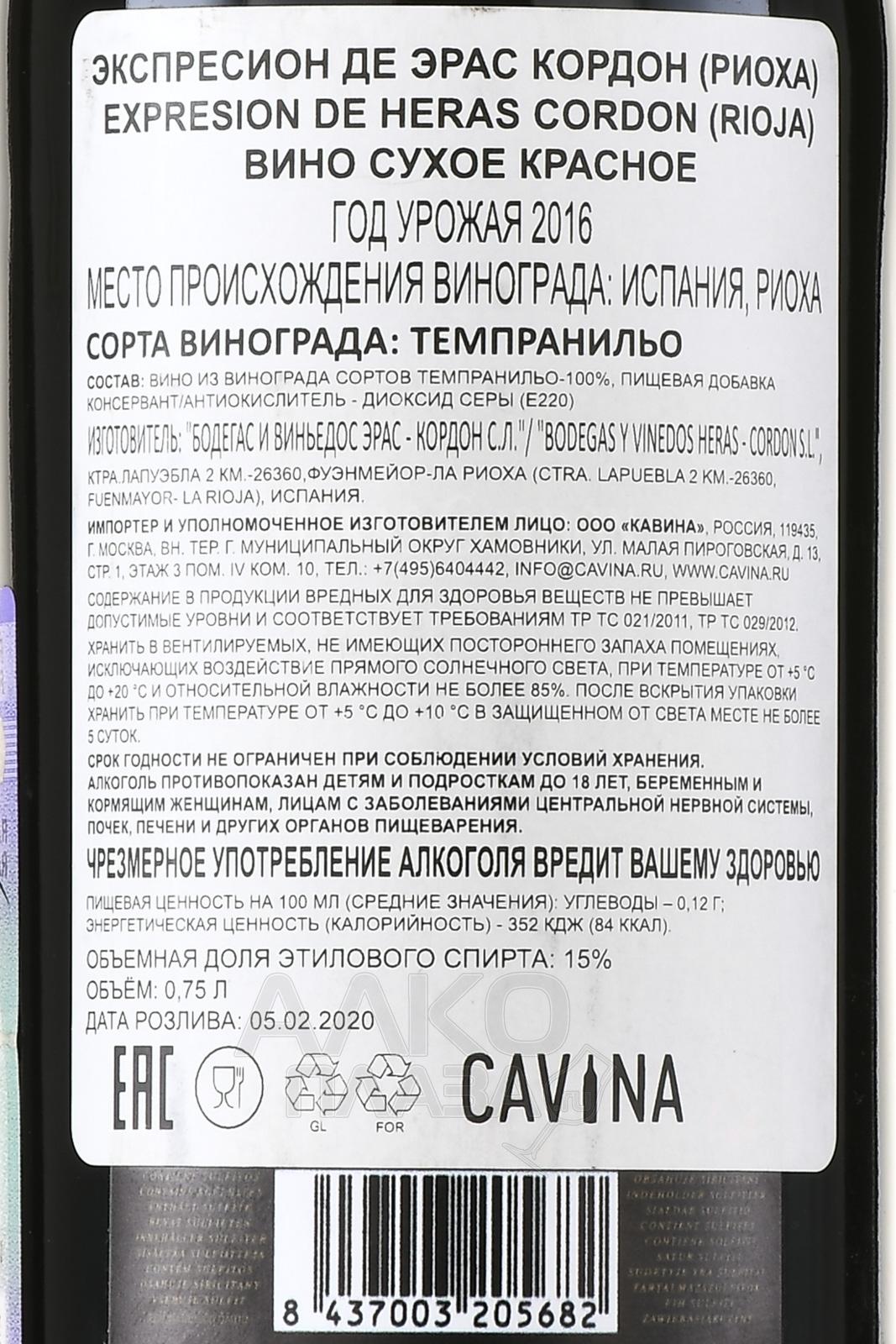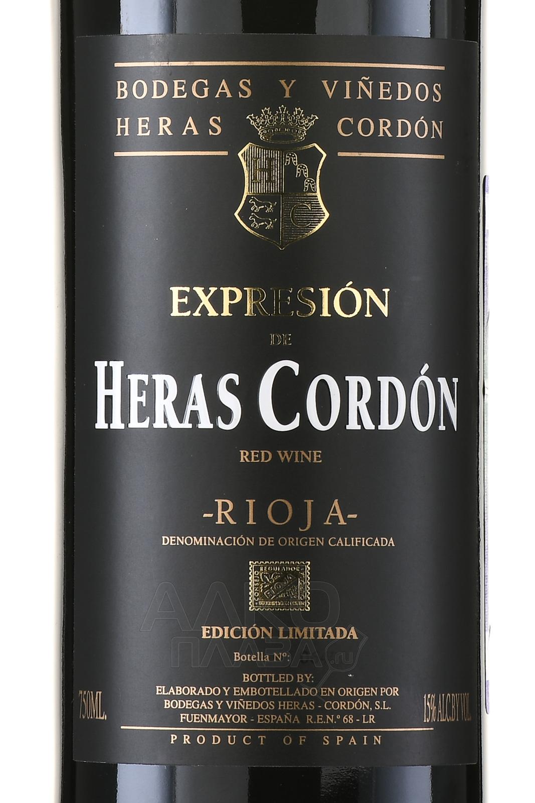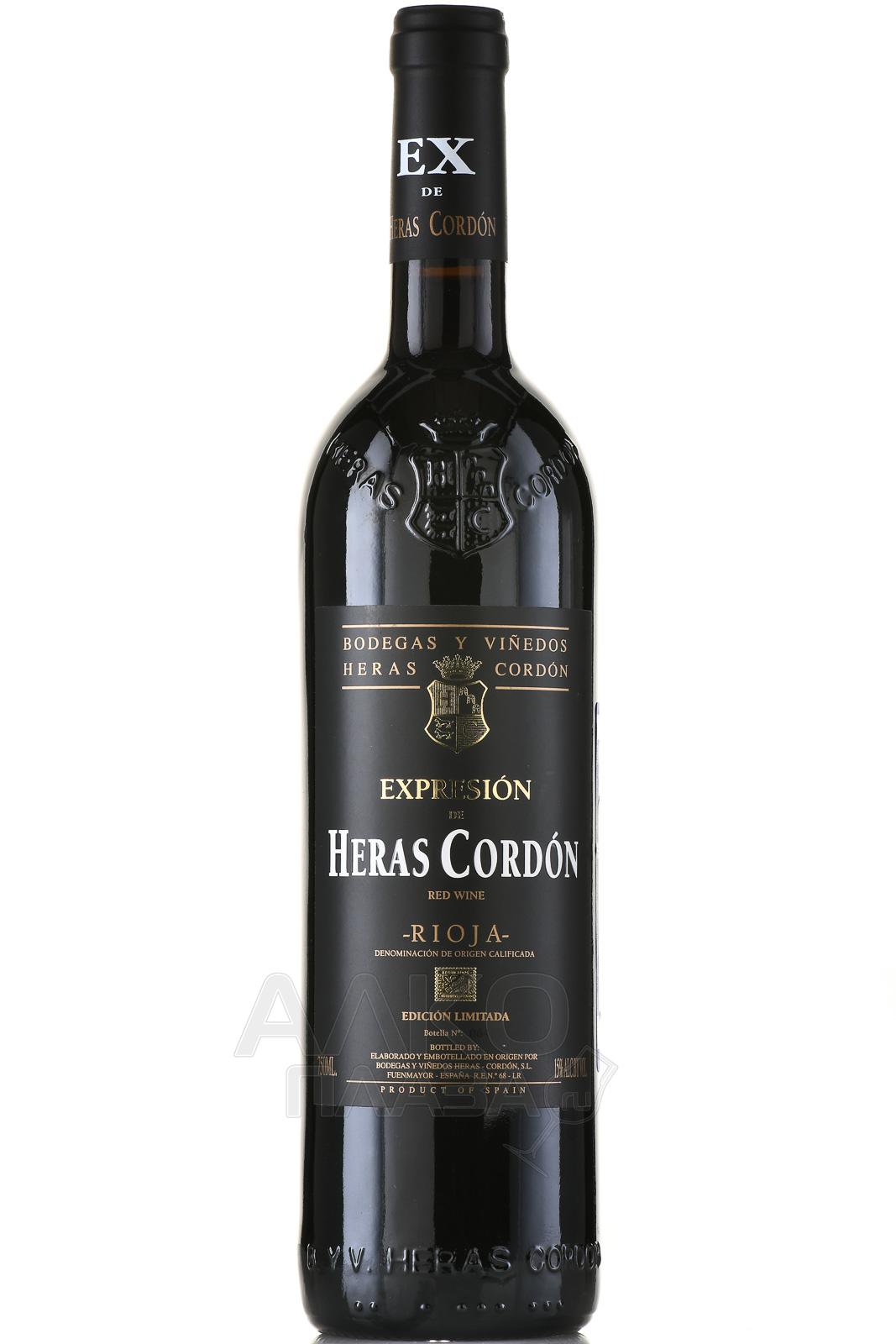 Красное сухое вино Heras Cordon Expresion 0,75 л производится из сорта Темпранильо со старых лоз возрастом около 55 лет. Виноград собирают вручную. Отбирают только здоровые и спелые ягоды. Терруар Риохи сочетает известковые и глинистые почвы, континентальный климат и заметные перепады температур. Это формирует высокую концентрацию и зрелую структуру ягод. Первичное брожение проходит в резервуарах из нержавеющей стали при 30°C в течение месяца. Используются натуральные дрожжи, проводится ежедневное перемешивание сусла. Малолактическая ферментация протекает в новых бочках из французского дуба. Далее следует выдержка 22 месяца в дубе. Вино отличается глубиной и мощным характером.