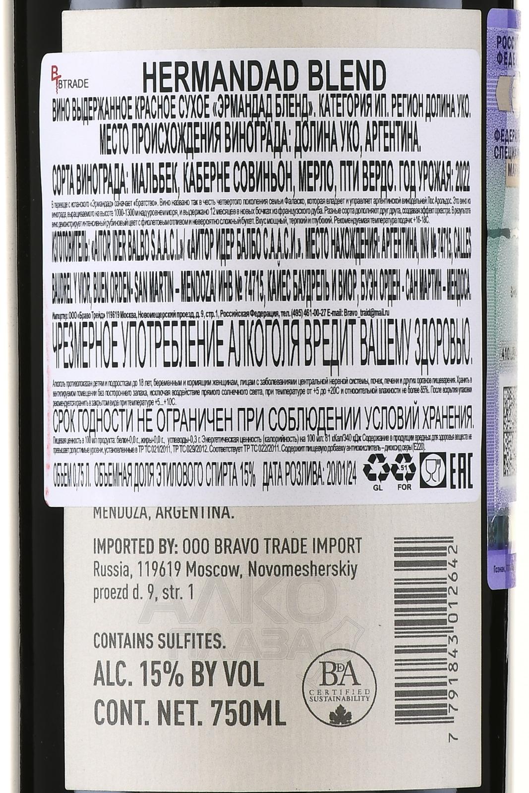 Красное сухое вино Hermandad Blend 0,75 л — благородный аргентинский бленд, созданный из винограда 4 сортов, которые культивируются в долине Уко на высоте 1000–1200 метров над уровнем моря. Здесь прохладные ночи и яркое дневное солнце придают ягодам насыщенный вкус и аромат. Урожай собирали вручную с нескольких участков, что позволило достичь гармонии и сложности профиля вина. Предферментационная мацерация протекала 48 часов при 8 °C. Контролируемая ферментация длилась 3 недели, проводилась малолактика. Вино выдерживалось 12 месяцев в бочках из французского дуба, из которых 60% были новыми. Такая технология делает Hermandad Blend сбалансированным, глубоким и элегантным. Это вино отмечено высокими оценками критиков и входит в подборки лучших аргентинских купажей благодаря своей четкой структуре и выразительному характеру.
