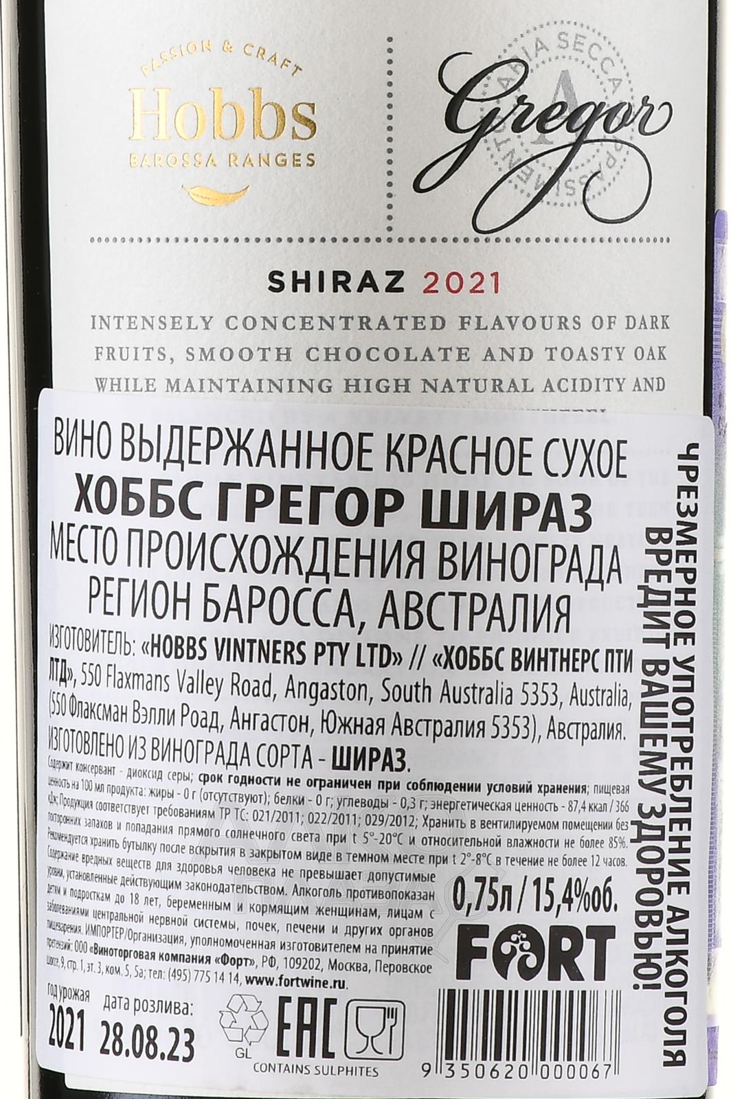 Красное сухое вино Hobbs Gregor Shiraz 0,75 л создано в Австралии в регионе Баросса, известном своим контрастным микроклиматом. Здесь теплые дни сочетаются с прохладными ночами. Такие условия обеспечивают винограду насыщенность и хорошую кислотность. Урожай собирают вручную с виноградников со старыми лозами, что гарантирует концентрированный вкус у сырья. Ферментация проводится традиционным способом в открытых чанах, после чего вино выдерживается в дубовых бочках, главным образом французских. Такой подход позволяет раскрыть сложный ароматический профиль и придать структуру. Этот Шираз получил высокие оценки от критиков и был включен в престижные винные рейтинги, что подчеркивает его статус и исключительное качество.