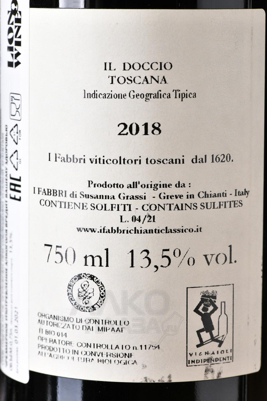 Красное сухое вино I Fabbri Il Doccio 0,75 л обладает элегантным профилем с бархатистыми танинами. Оно произведено из сорта Мерло с тосканского виноградника в окрестностях города Ламоле. Лозы растут на террасах на высоте 580 м, их обдувают прохладные морские бризы. Был использован урожай ручного сбора, который осуществлялся в середине сентября. Мацерация и алкогольная ферментация в стали длились 10 дней. Вино 1,5 года выдерживалось в 500-литровых французских бочках (третьего наполнения) из дуба, выращенного в центральной части страны. Затем оно дозревало в бутылке. Вино было выпущенно ограниченным тиражом, каждый экземпляр получил индивидуальный номер.