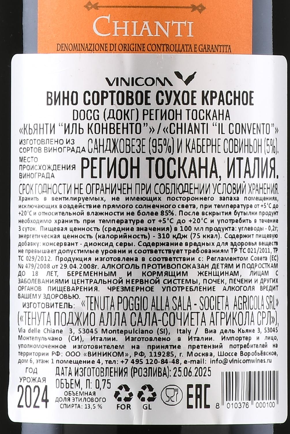 Красное сухое вино Il Convento Chianti DOCG 0,75 л создано в сердце Тосканы, в зоне Кьянти, известной своими глинисто-известковыми почвами и мягким климатом. В основе вина — классический сорт Санджовезе с небольшим добавлением Каберне Совиньона, придающим структуру и глубину. Ферментация проходила в контакте с кожицей в течение 2 недель, что позволило сохранить насыщенный цвет и выразительные таннины. После алкогольного брожения началось малолактическое, затем последовала выдержка — 8 месяцев в дубовых бочках. Это вино — типичный представитель традиционного Кьянти, ценимый за чистоту вкуса и гармоничное сочетание фруктовых и древесных нот.