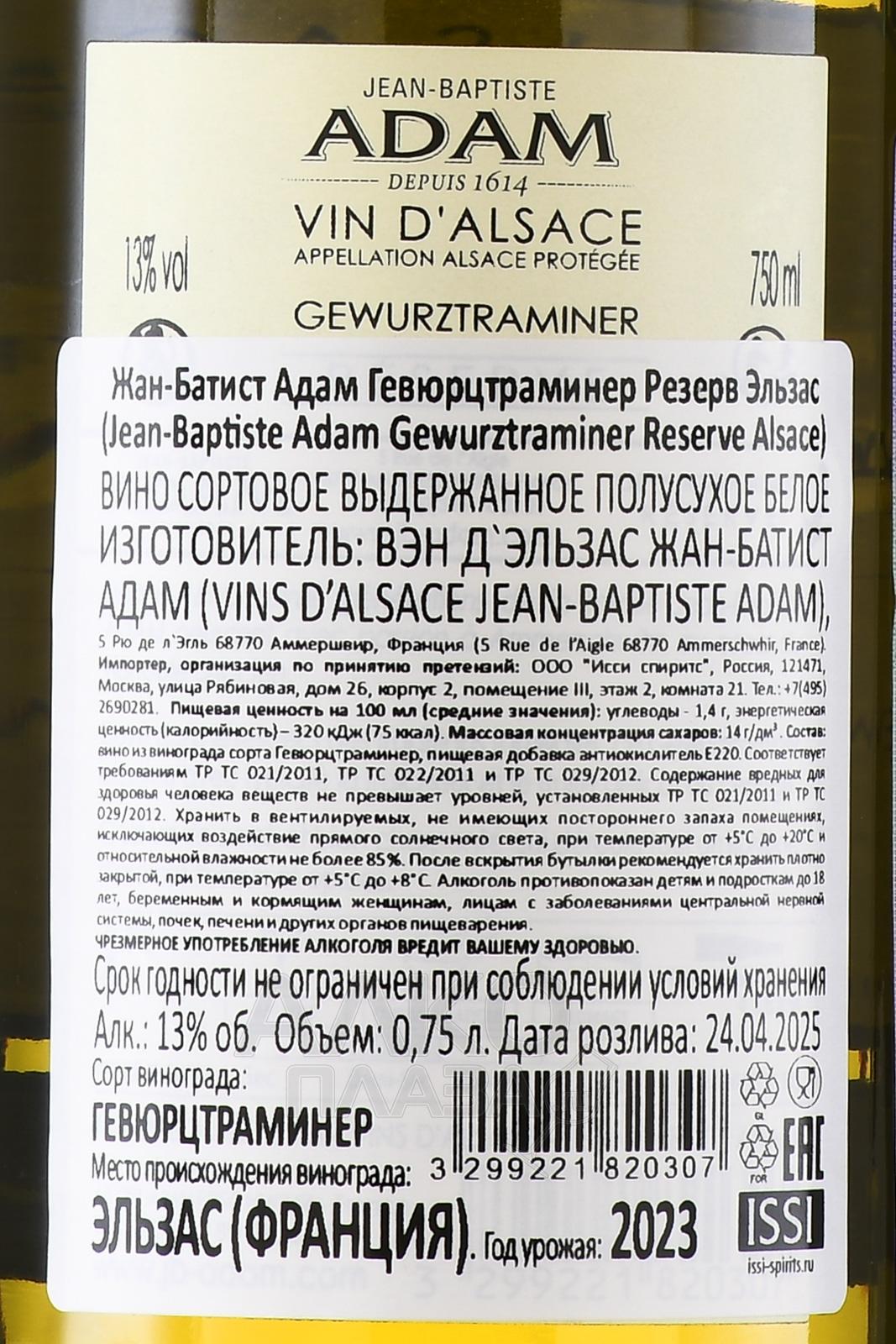 Белое полусухое вино Jean-Baptiste Adam Gewurztraminer Reserve 0,75 л производится в Эльзасе, регионе с давними традициями работы с ароматными сортами. Виноградники хозяйства расположены на склонах с известняково-глинистыми и мергелевыми почвами, где умеренный континентальный климат способствует медленному созреванию ягод и накоплению выразимых ароматических соединений. Напиток создаётся из полностью созревшего винограда, собранного вручную, с последующей ферментацией при контролируемой температуре.