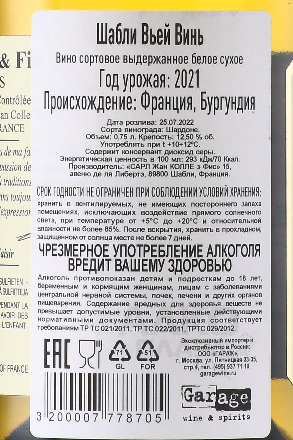 Белое сухое вино Jean Collet et Fils Chablis Vieilles Vignes 0,75 л производится в апелласьоне Шабли на севере Бургундии. Виноградники хозяйства расположены на почвах из киммериджского известняка с включениями ископаемых раковин. Этот тип терруара формирует чёткую минеральную линию и высокую естественную кислотность. Климат — прохладный, с риском весенних заморозков, что влияет на стиль напитка и сохраняет свежесть ягод. Указание Vieilles Vignes означает использование лоз значительного возраста, что способствует более концентрированному сырью. Вино создают из одного сорта. После мягкого прессования сусло ферментируют при контролируемой температуре. До розлива проводится созревание на осадке.