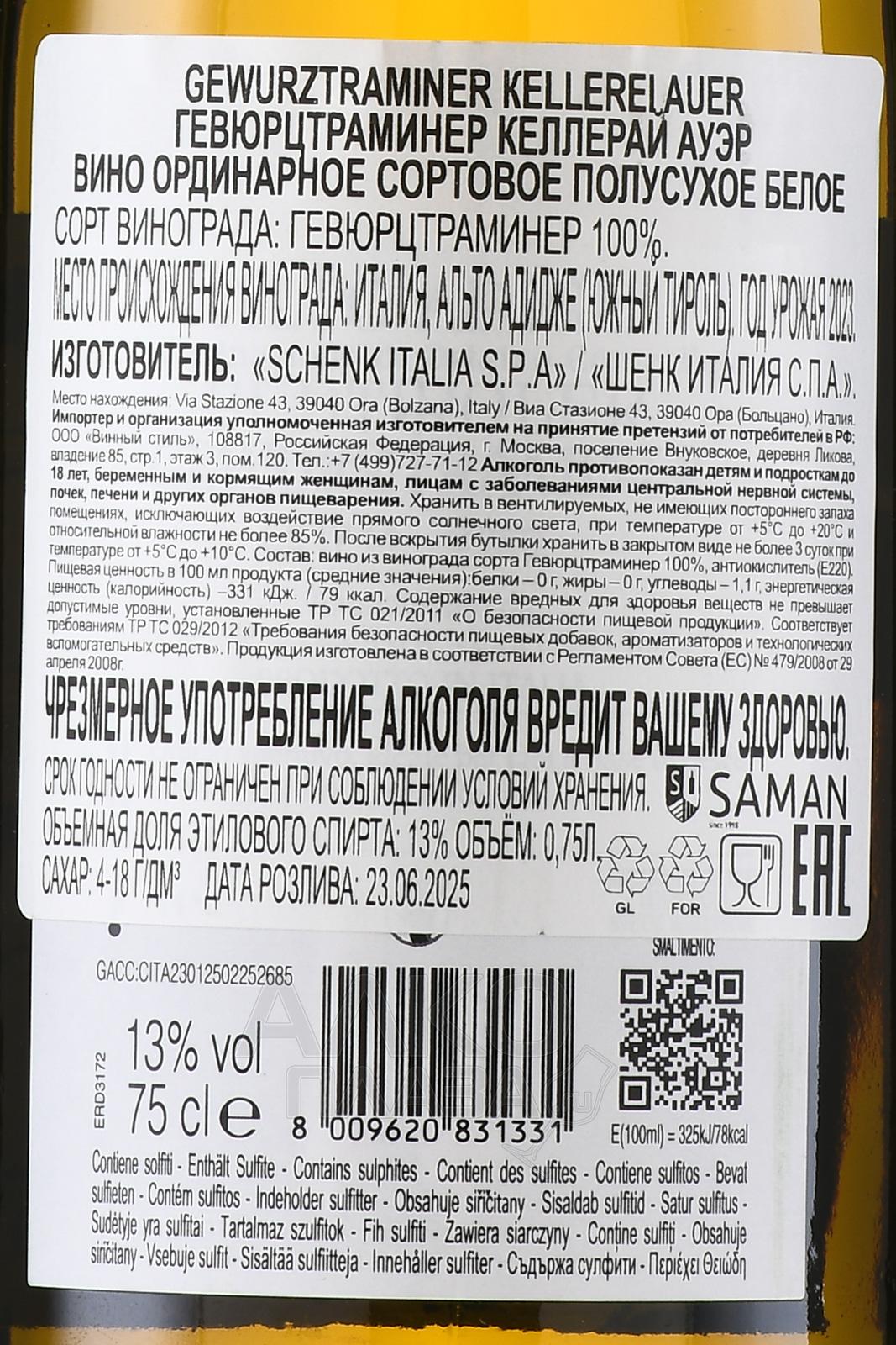 Белое полусухое вино Kellerei Auer Gewurztraminer 2020 г. отличается умеренной сахаристостью и классической крепостью — 13,5%. Винтаж родом из итальянского региона Трентино-Альто-Адидже получен из винограда, выращенного на богатых глиной и известняков почвах в условиях мягкого климата Альп со средиземноморскими проявлениями. Ягоды собрали на пике зрелости, подвергли мягкому прессованию и мацерации от 6 до 8 часов, а также сбраживанию в стальных цистернах при 14-16 °C с участием натуральных дрожжей.