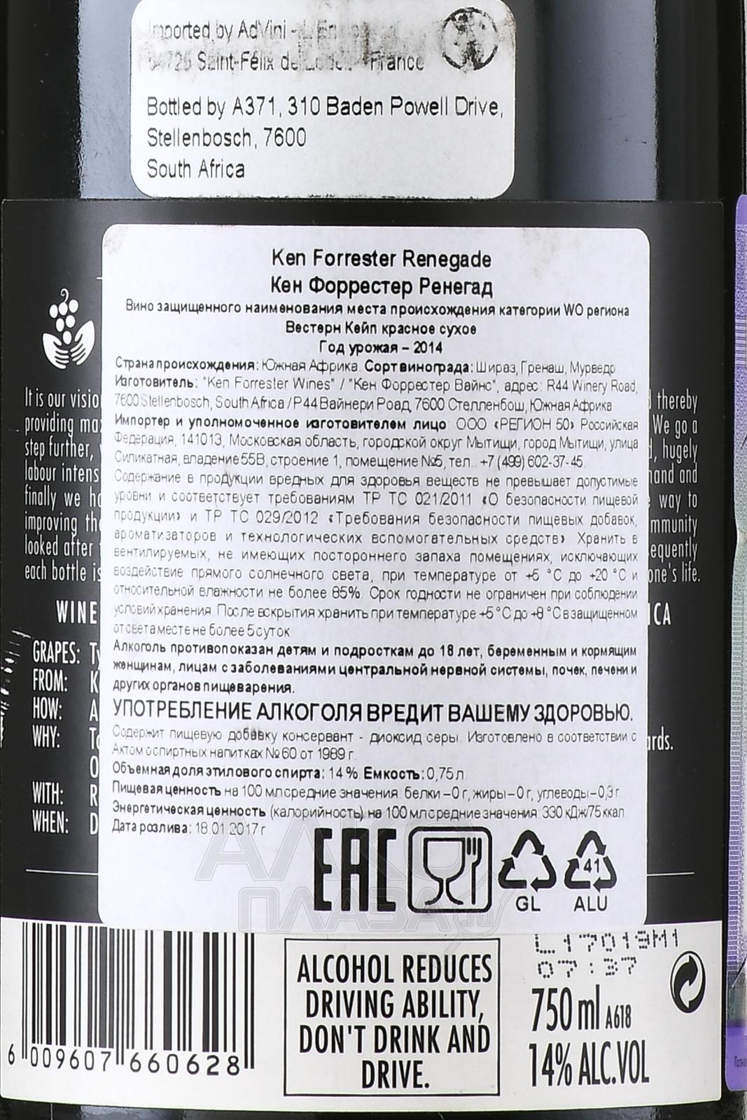 Красное сухое вино Ken Forrester Renegade Stellenbosch WO 0,75 л – яркое сочетание древних традиций с модными инновациями, в полной мере отображающее уникальность терруара Стелленбош. Посадки разбиты на склонах горы Хельдерберг. Почвы, состоящие из глины и песка с незначительными участками суглинка, вкупе с прохладными климатическими условиями дают возможность винограду полностью показать свой потенциал. Созревший урожай в 2014 году собирали вручную. Ферментация производилась в открытых цистернах при постоянном температурном контроле. Чтобы максимально извлечь цвет и танины, регулярно проводилась перекачка сусла. После деликатного отжима вино полтора года созревало во французских дубовых бочках второго и третьего наполнения. Благодаря столь длительной выдержке напиток приобретает сложную структуру, многогранность и глубину дегустационной палитры. Вино Кен Форрестер Ренегад урожая 2014 г. завоевало серебряную медаль на престижном конкурсе в 2019 году.