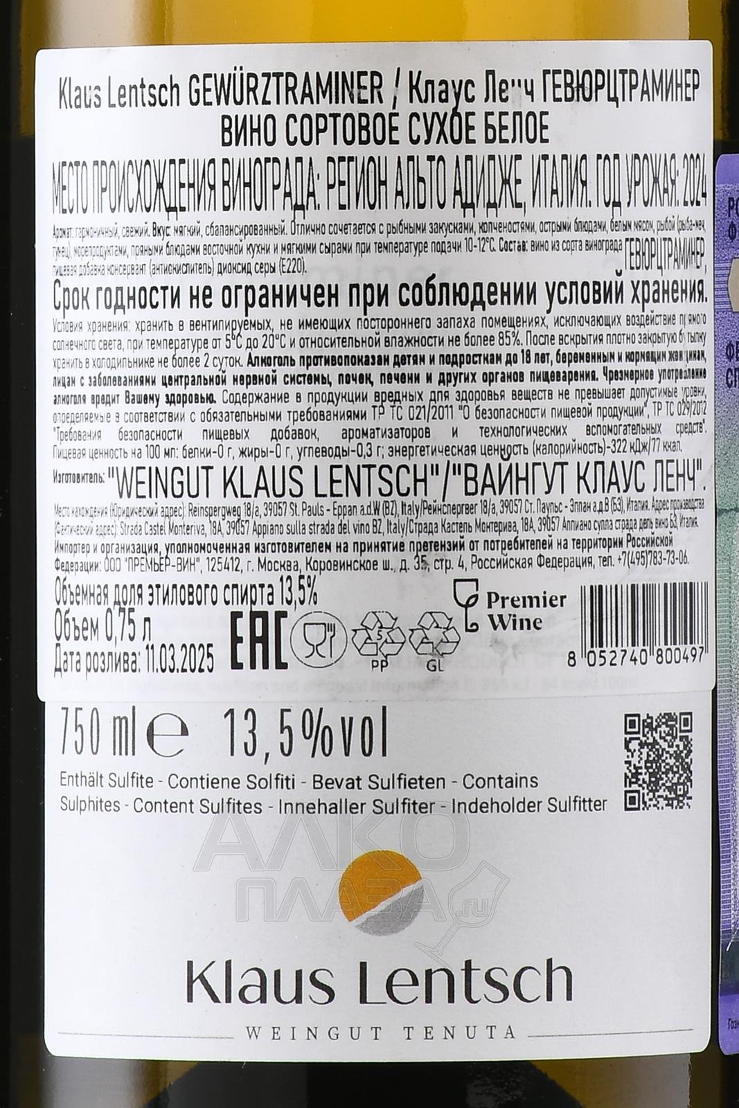 Белое сухое вино Klaus Lentsch Gewurztraminer 0,75 л происходит из северной Италии, из региона Альто-Адидже. Виноградники хозяйства расположены на склонах с выраженным перепадом высот. Здесь сочетаются прохладный альпийский климат и интенсивное солнечное освещение. Почвы — преимущественно известняковые с примесью глины и порфира. Такие условия способствуют медленному созреванию ягод, сохранению кислотности и формированию выразительного ароматического профиля. Производство основано на бережной переработке винограда. Ферментация проходит в стальных ёмкостях при контролируемой температуре. Это позволяет сохранить первичные ароматы и свежесть. Выдержка осуществляется также в нержавеющей стали, без контакта с дубом.