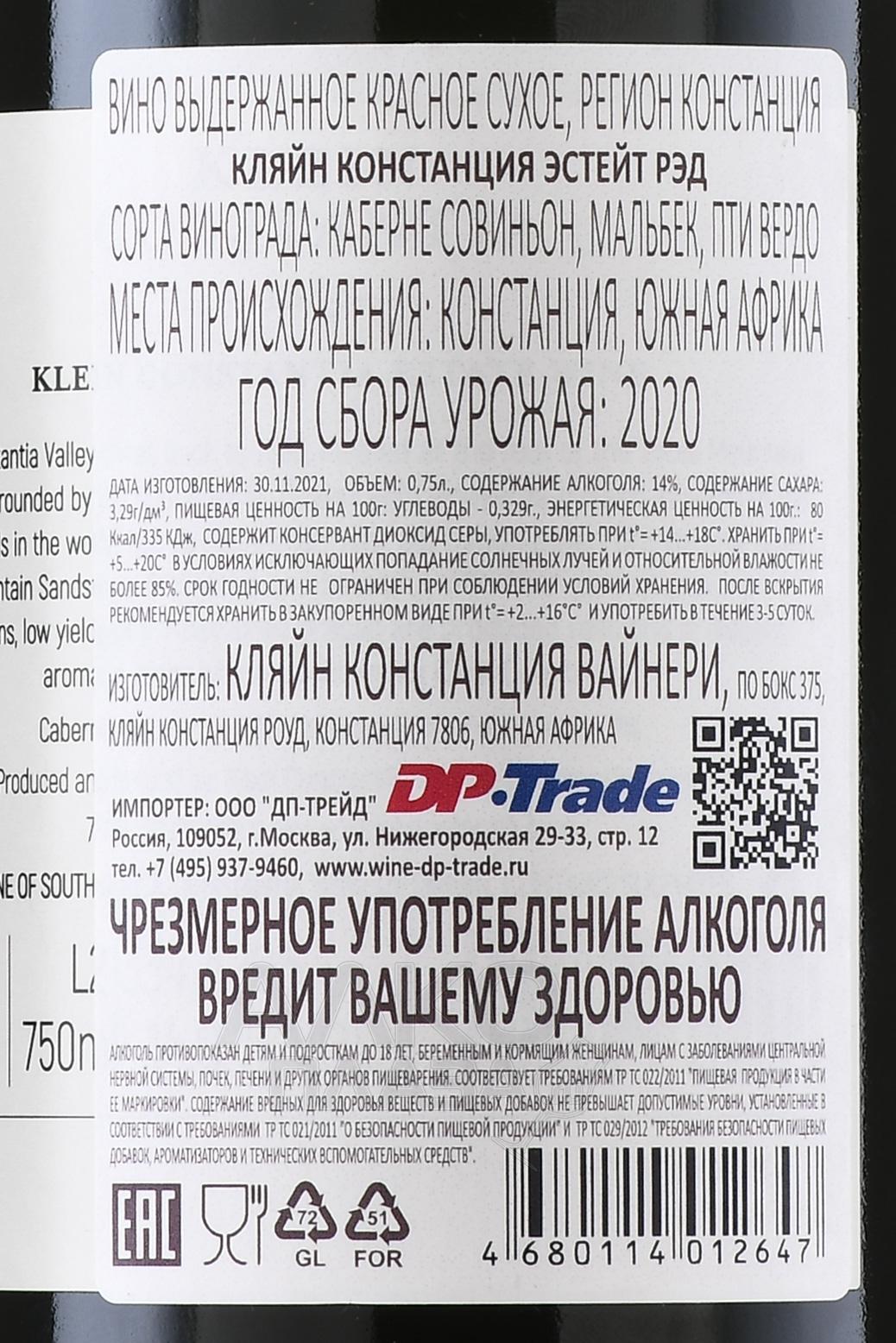 Красное сухое вино Klein Constantia Estate Red 0,75 л производит старейшая винодельня ЮАР, которая входит в ТОП-25 лучших в мире. В роли сырья выступают 4 самых популярных южноафриканских красных сорта, которые культивируются на виноградниках Долины Констанции (Западный Кейп, Стелленбош). Многие годы виноделы компании Klein Constantia занимались подбором компонентов для купажа, совершенствовали рецептуру и технологию. Результатом большой работы явилось изысканное и идеально сбалансированное вино. Для него используется виноград оптимальной спелости, выращенный в прохладном климате, отличающийся безупречной органолептикой. Урожай дважды сортируют, после чего подвергают гребнеотделению и прессованию. Винификация протекает в стали при контролируемой температуре, затем вино 1,5 года выдерживается в старых и новых бочках из французского дуба.